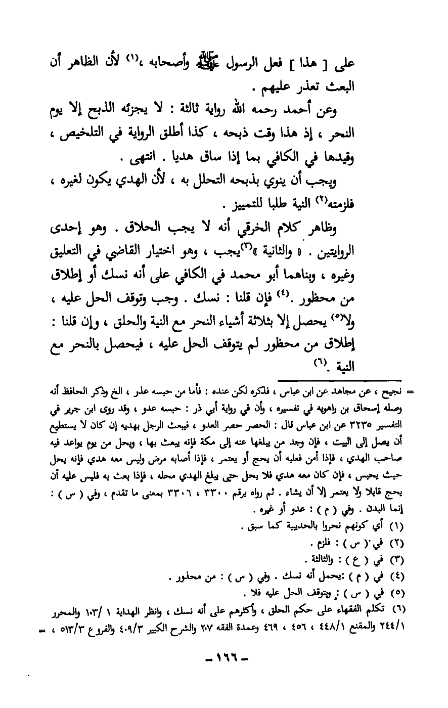 وظاهر كلام الخرقي أنه لا يجب الحلاق. وهو إحدى الروايتين. «والثانية» يجب، وهو اختيار القاضي في التعليق وغيره، وبناهما أبو محمد في الكافي على أنه نسك أو إطلاق من محظور. فإن قلنا: نسك. وجب وتوقف الحل عليه، ولا يحصل إلا بثلاثة أشياء النحر مع النية والحلق، وإن قلنا: إطلاق من محظور لم يتوقف الحل عليه، فيحصل بالنحر مع النية.