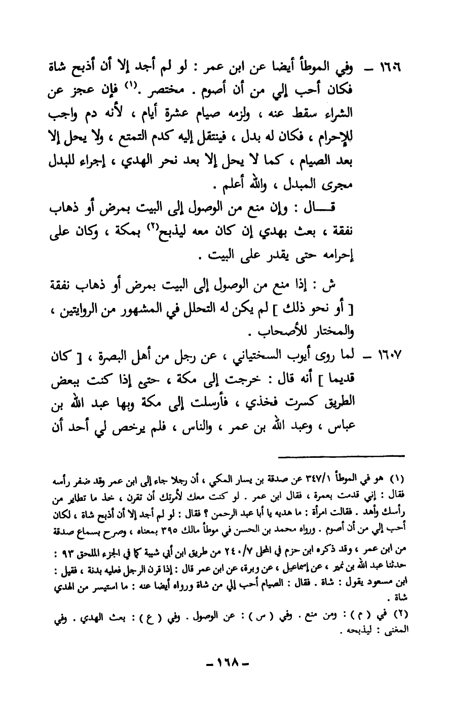 1607 - لما روى أيوب السختياني، عن رجل من أهل البصرة [كان قديما] أنه قال: خرجت إلى مكة، حتى إذا كنت ببعض الطريق كسرت فخذي، فأرسلت إلى مكة وبها عبد الله بن عباس، وعبد الله بن عمر، والناس، فلم يرخص لي أحد أن