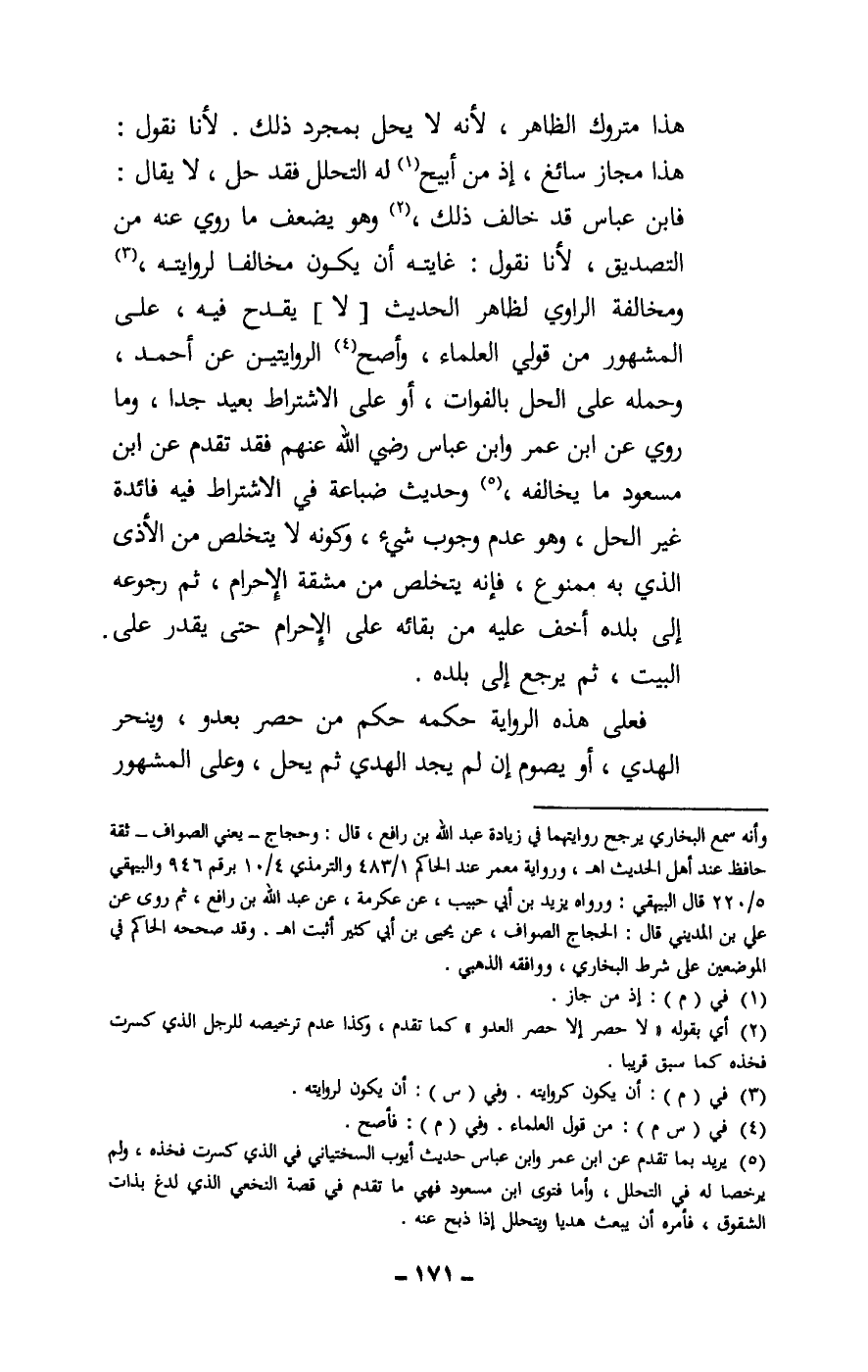 هذا متروك الظاهر، لأنه لا يحل بمجرد ذلك. لأنا نقول: هذا مجاز سائغ، إذ من أبيح له التحلل فقد حل، لا يقال: فابن عباس قد خالف ذلك، وهو يضعف ما روي عنه من التصديق، لأنا نقول: غايته أن يكون مخالفا لروايته، ومخالفة الراوي لظاهر الحديث [لا] يقدح فيه، على المشهور من قولي العلماء، وأصح الروايتين عن أحمد، وحمله على الحل بالفوات، أو على الاشتراط بعيد جدا، وما روي عن ابن عمر وابن عباس - رَضِيَ اللَّهُ عَنْهُمْ - فقد تقدم عن ابن مسعود ما يخالفه، وحديث ضباعة في الاشتراط فيه فائدة غير الحل، وهو عدم وجوب شيء، وكونه لا يتخلص من الأذى الذي به ممنوع، فإنه يتخلص من مشقة الإحرام، ثم رجوعه إلى بلده أخف عليه من بقائه على الإحرام حتى يقدر على البيت، ثم يرجع إلى بلده.