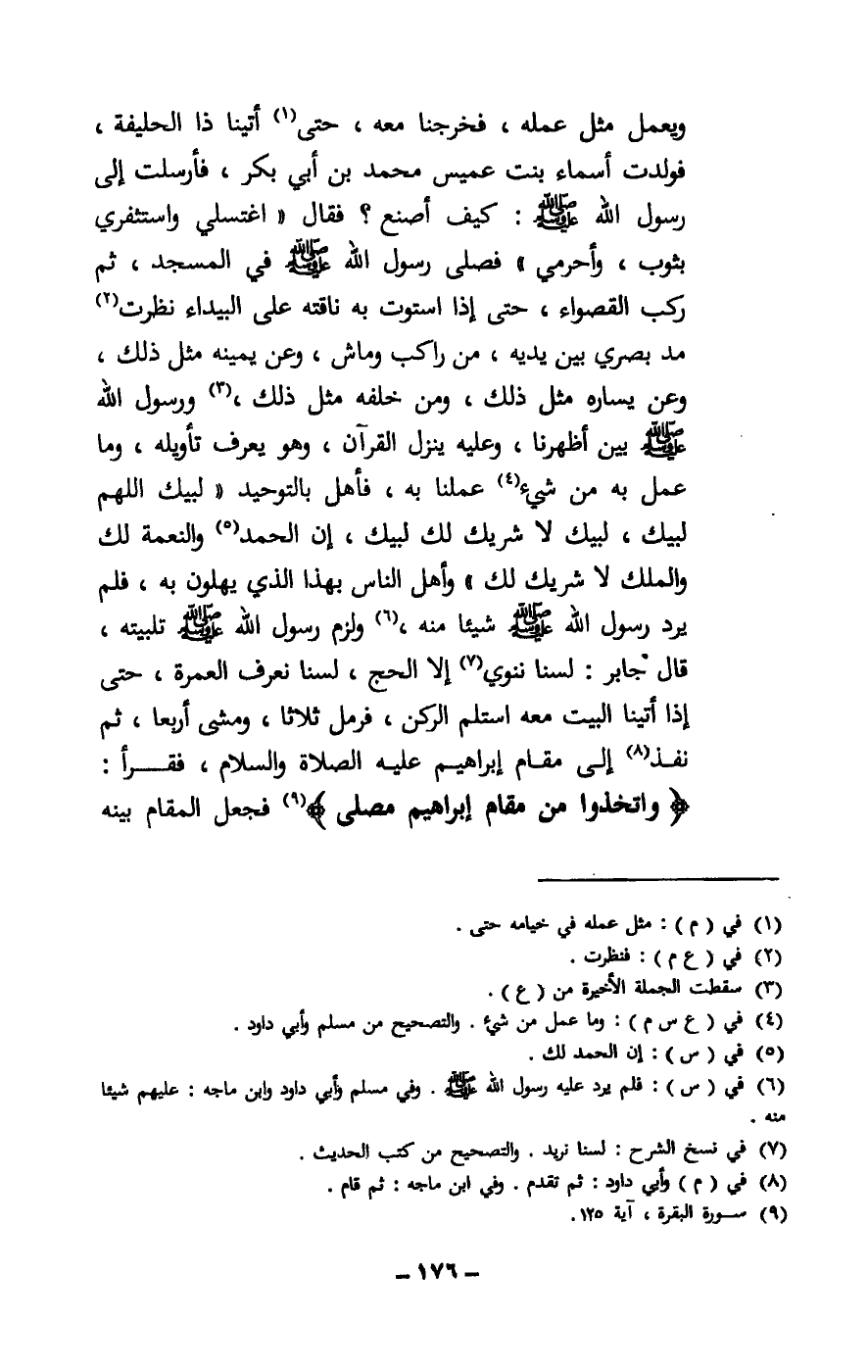 ويعمل مثل عمله، فخرجنا معه، حتى أتينا ذا الحليفة، فولدت أسماء بنت عميس محمد بن أبي بكر، فأرسلت إلى رسول الله - صَلَّى اللَّهُ عَلَيْهِ وَسَلَّمَ -: كيف أصنع؟ فقال «اغتسلي واستثفري بثوب، وأحرمي» فصلى رسول الله - صَلَّى اللَّهُ عَلَيْهِ وَسَلَّمَ - في المسجد، ثم ركب القصواء، حتى إذا استوت به ناقته على البيداء نظرت مد بصري بين يديه، من راكب وماش، وعن يمينه مثل ذلك، وعن يساره مثل ذلك، ومن خلفه مثل ذلك، ورسول الله - صَلَّى اللَّهُ عَلَيْهِ وَسَلَّمَ - بين أظهرنا، وعليه ينزل القرآن، وهو يعرف تأويله، وما عمل به من شيء عملنا به، فأهل بالتوحيد «لبيك اللهم لبيك، لبيك لا شريك له لبيك، إن الحمد والنعمة لك والملك لا شريك لك» وأهل الناس بهذا الذي يهلون به، فلم يرد رسول الله - صَلَّى اللَّهُ عَلَيْهِ وَسَلَّمَ - شيئا منه، ولزم رسول الله - صَلَّى اللَّهُ عَلَيْهِ وَسَلَّمَ - تلبيته، قال جابر: لسنا ننوي إلا الحج، لسنا نعرف العمرة، حتى إذا أتينا البيت معه استلم الركن، فرمل ثلاثا، ومشى أربعا، ثم نفذ إلى مقام إبراهيم - عَلَيْهِ الصَّلَاةُ وَالسَّلَامُ -، فقرأ {وَاتَّخِذُوا مِنْ مَقَامِ إِبْرَاهِيمَ مُصَلًّى} [البقرة: 125] فجعل المقام بينه