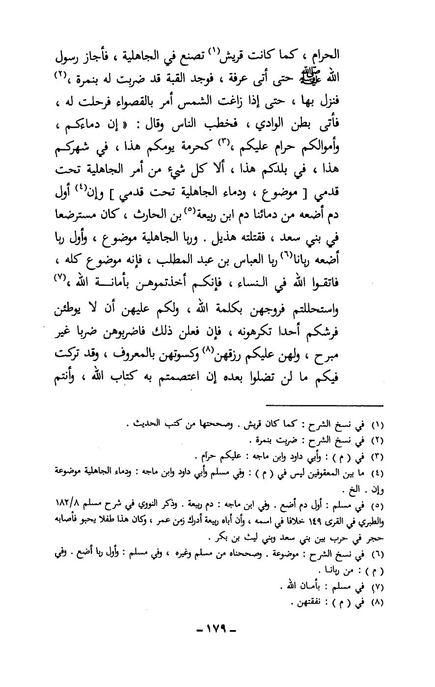الحرام، كما كانت قريش تصنع في الجاهلية، فأجاز رسول الله - صَلَّى اللَّهُ عَلَيْهِ وَسَلَّمَ - حتى أتى عرفة، فوجد القبة قد ضربت له بنمرة، فنزل بها، حتى إذا زاغت الشمس أمر بالقصواء فرحلت له، فأتى بطن الوادي، فخطب الناس وقال: «إن دماءكم، وأموالكم حرام عليكم، كحرمة يومكم هذا، في شهركم هذا، في بلدكم هذا، ألا كل شيء من أمر الجاهلية تحت قدمي [موضوع، ودماء الجاهلية تحت قدمي] وإن أول دم أضعه من دمائنا دم ابن ربيعة بن الحارث، كان مسترضعا في بني سعد، فقتلته هذيل. وربا الجاهلية موضوع، وأول ربا أضعه ربانا ربا العباس بن عبد المطلب، فإنه موضوع كله، فاتقوا الله في النساء، فإنكم أخذتموهن بأمانة الله، واستحللتم فروجهن بكلمة الله، ولكم عليهن أن لا يوطئن فرشكم أحدا تكرهونه، فإن فعلن ذلك فاضربوهن ضربا غير مبرح، ولهن عليكم رزقهن وكسوتهن بالمعروف، وقد تركت فيكم ما لن تضلوا بعده إن اعتصمتم به كتاب الله، وأنتم