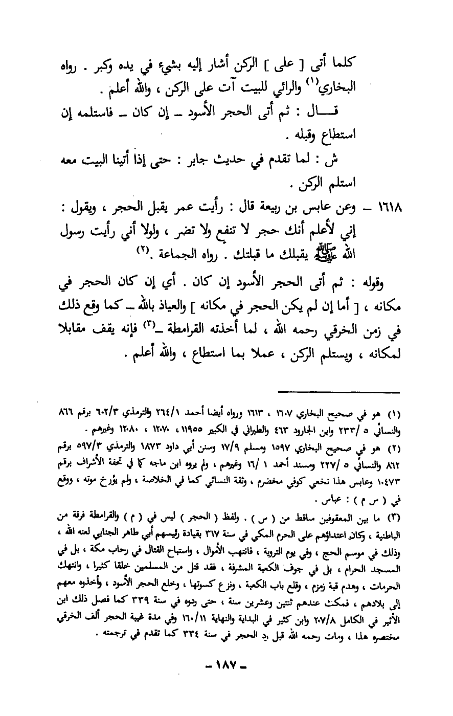 1618 - «وعن عابس بن ربيعة قال: رأيت عمر يقبل الحجر، ويقول: إني لأعلم أنك حجر لا تنفع ولا تضر، ولولا أني رأيت رسول الله - صَلَّى اللَّهُ عَلَيْهِ وَسَلَّمَ - يقبلك ما قبلتك» . رواه الجماعة.