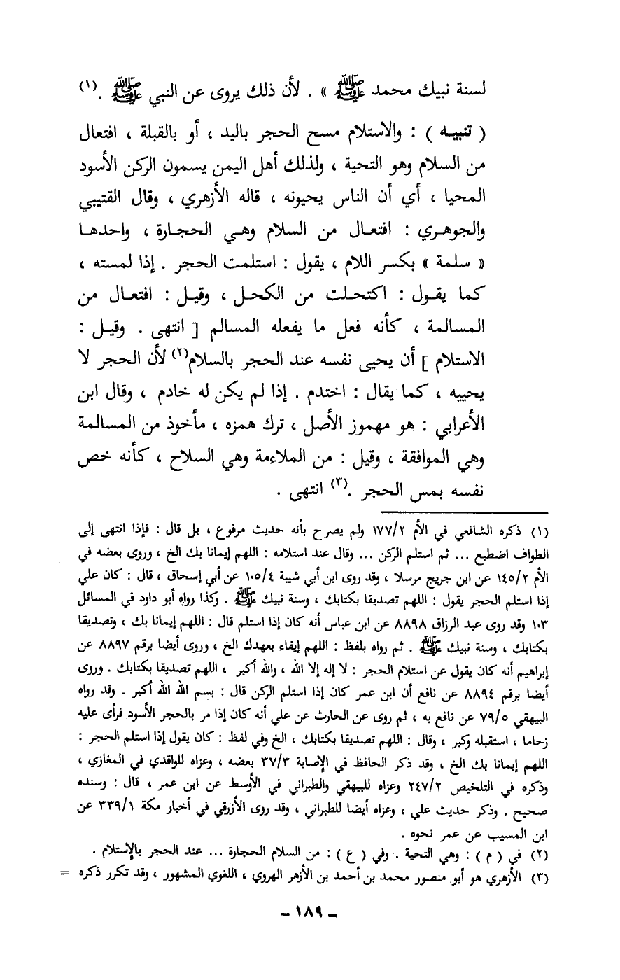(تنبيه) : والاستلام مسح الحجر باليد، أو بالقبلة، افتعال من السلام وهو التحية، ولذلك أهل اليمن يسمون الركن الأسود المحيا، أي أن الناس يحيونه، قاله الأزهري، وقال القتيبي والجوهري: افتعال من السلام وهي الحجارة، واحدها «سلمة» بكسر اللام، يقول: استلمت الحجر. إذا لمسته، كما يقول: اكتحلت من الكحل، وقيل: افتعال من المسالمة، كأنه فعل ما يفعله المسالم [انتهى. وقيل: الاستلام] أن يحيى نفسه عند الحجر بالسلام لأن الحجر لا يحييه، كما يقال: اختدم. إذا لم يكن له خادم، وقال ابن الأعرابي: هو مهموز الأصل، ترك همزه، مأخوذ من المسالمة وهي الموافقة، وقيل: من الملاءمة وهي السلاح، كأنه خص نفسه بمس الحجر. انتهى.