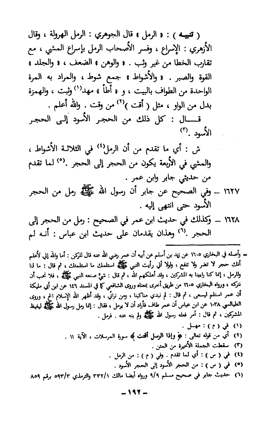 1628 - وكذلك في حديث ابن عمر في الصحيح: رمل من الحجر إلى الحجر. وهذان يقدمان على حديث ابن عباس: أنه لم