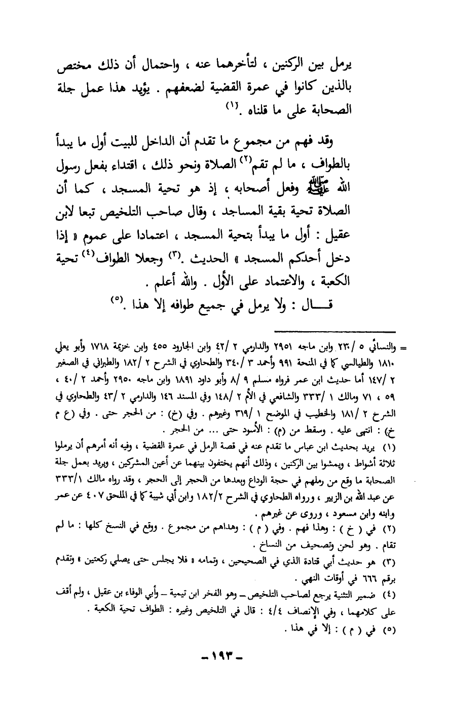 يرمل بين الركنين، لتأخرهما عنه، واحتمال أن ذلك مختص بالذين كانوا في عمرة القضية لضعفهم. يؤيد هذا عمل جلة الصحابة على ما قلناه.