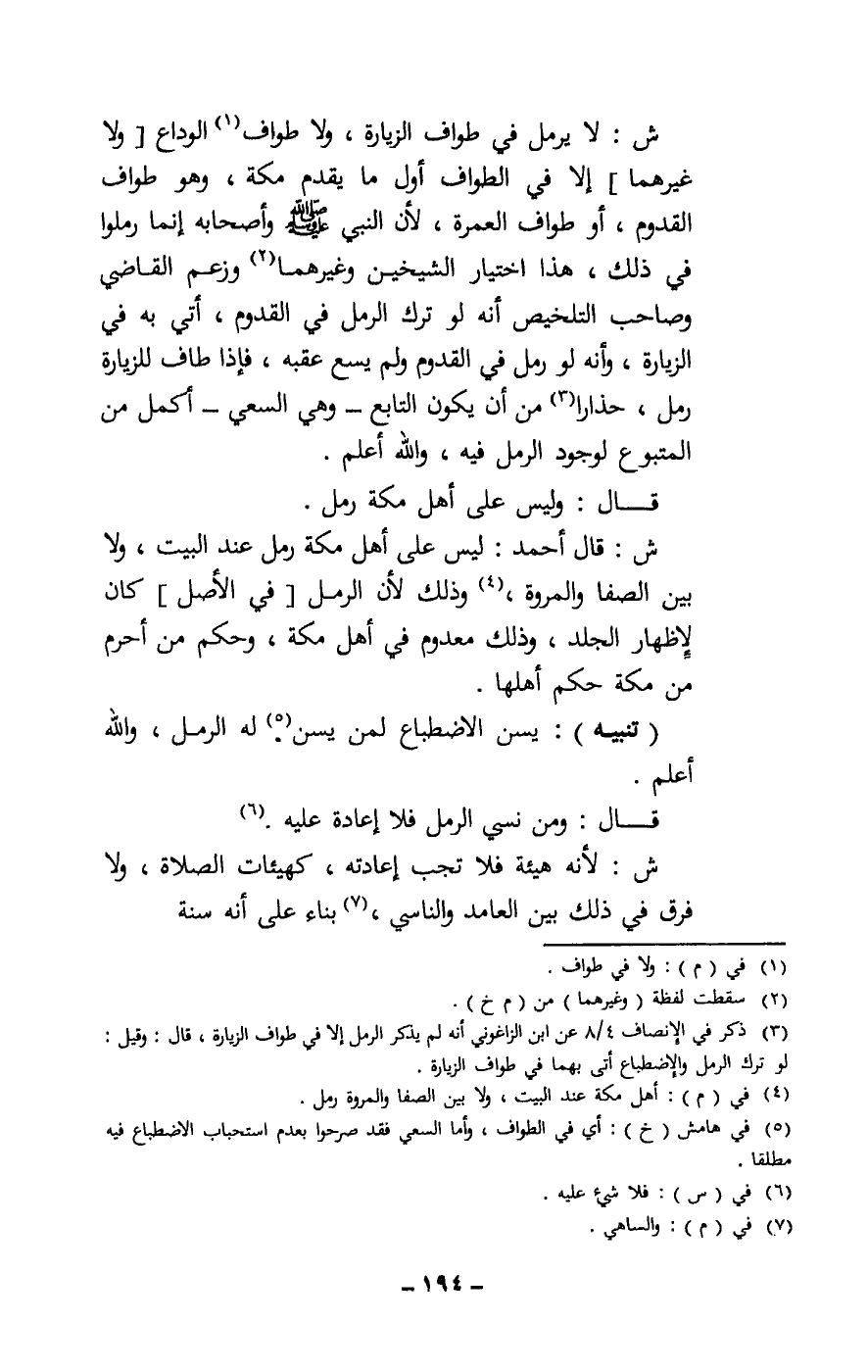 ش: لا يرمل في طواف الزيارة، ولا طواف الوداع [ولا غيرهما] إلا في الطواف أول ما يقدم مكة، وهو طواف القدوم، أو طواف العمرة، لأن النبي - صَلَّى اللَّهُ عَلَيْهِ وَسَلَّمَ - وأصحابه إنما رملوا في ذلك، هذا اختيار الشيخين وغيرهما، وزعم القاضي وصاحب التلخيص أنه لو ترك الرمل في القدوم، أتى به في الزيارة، وأنه لو رمل في القدوم ولم يسع عقبه، فإذا طاف للزيارة رمل، حذارا من أن يكون التابع - وهي السعي - أكمل من المتبوع لوجود الرمل فيه، والله أعلم.