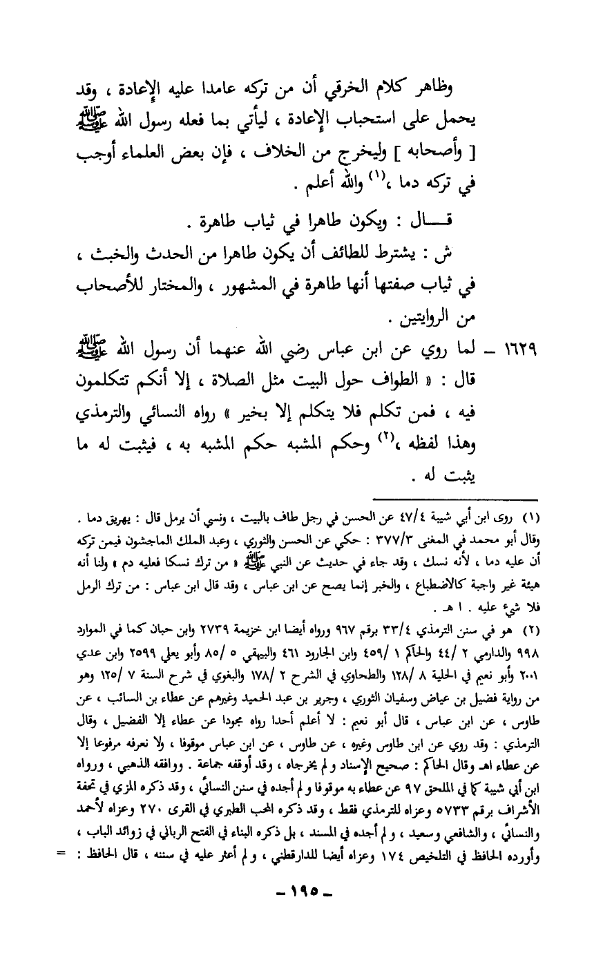 1629 - لما روي عن ابن عباس - رَضِيَ اللَّهُ عَنْهُمَا - أن رسول الله - صَلَّى اللَّهُ عَلَيْهِ وَسَلَّمَ - قال: «الطواف حول البيت مثل الصلاة، إلا أنكم تتكلمون فيه، فمن تكلم فلا يتكلم إلا بخير» رواه النسائي والترمذي وهذا لفظه، وحكم المشبه حكم المشبه به، فيثبت له ما يثبت له.