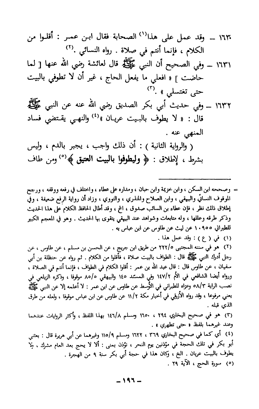 1631 - وفي الصحيح «أن النبي - صَلَّى اللَّهُ عَلَيْهِ وَسَلَّمَ - قال لعائشة - رَضِيَ اللَّهُ عَنْهَا -[لما حاضت] «فعلي ما يفعل الحاج، غير أن لا تطوفي بالبيت حتى تغتسلي» » .