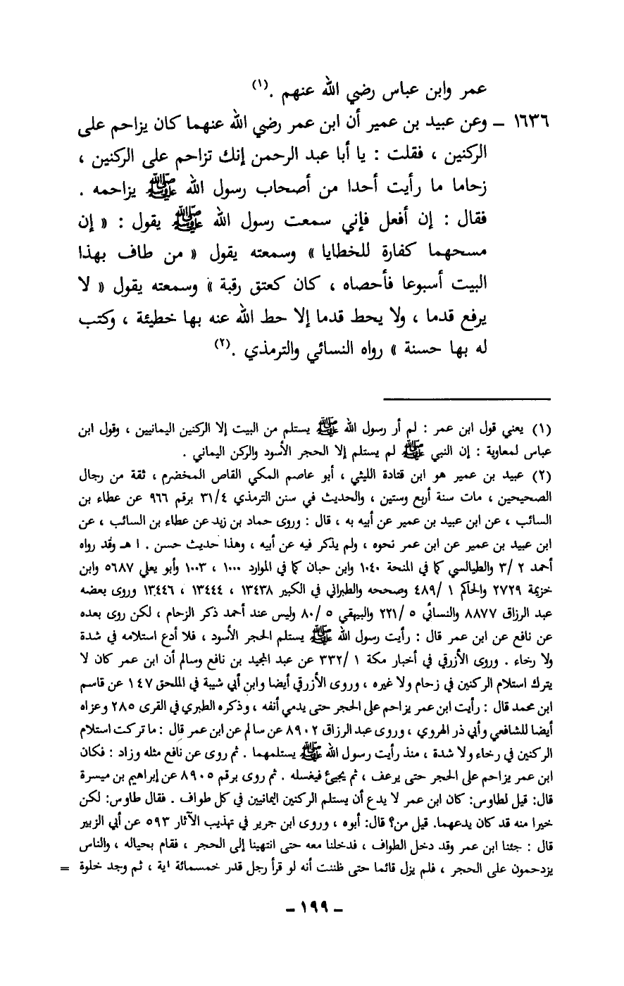 1636 - وعن عبيد بن عمير «أن ابن عمر - رَضِيَ اللَّهُ عَنْهُمَا - كان يزاحم على الركنين، فقلت: يا أبا عبد الرحمن إنك تزاحم على الركنين زحاما ما رأيت أحدا من أصحاب رسول الله - صَلَّى اللَّهُ عَلَيْهِ وَسَلَّمَ - يزاحمه. فقال: إن أفعل فإني سمعت رسول الله - صَلَّى اللَّهُ عَلَيْهِ وَسَلَّمَ - يقول: «إن مسحهما كفارة للخطايا» وسمعته يقول: «من طاف بهذا البيت أسبوعا فأحصاه، كان كعتق رقبة» وسمعته يقول: «لا يرفع قدما، ولا يحط قدما إلا حط الله عنه بها خطيئة، وكتب له بها حسنة» رواه النسائي والترمذي.