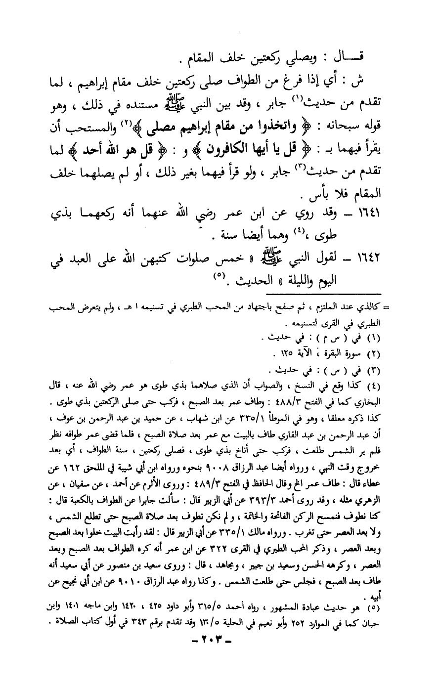 ش: أي إذا فرغ من الطواف صلى ركعتين خلف مقام إبراهيم، لما تقدم من حديث جابر، وقد بين النبي - صَلَّى اللَّهُ عَلَيْهِ وَسَلَّمَ - مستنده في ذلك، وهو قوله سبحانه: {وَاتَّخِذُوا مِنْ مَقَامِ إِبْرَاهِيمَ مُصَلًّى} [البقرة: 125] والمستحب أن يقرأ فيهما بـ: {قُلْ يَاأَيُّهَا الْكَافِرُونَ} [الكافرون: 1] و: {قُلْ هُوَ اللَّهُ أَحَدٌ} [الإخلاص: 1] لما تقدم من حديث جابر، ولو قرأ فيهما بغير ذلك، أو لم يصلهما خلف المقام فلا بأس.