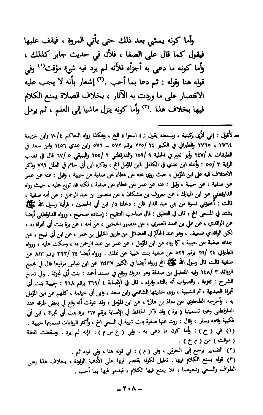وأما كونه يمشي بعد ذلك حتى يأتي المروة، فيقف عليها فيقول كما قال على الصفا، فلأن في حديث جابر كذلك، وأما كونه ما دعا به أجزأه فلأنه لم يرد فيه شيء مؤقت وفي قوله هنا وقوله: ثم دعا بما أحب. إشعار بأنه لا يجب عليه الاقتصار على ما وردت به الآثار، بخلاف الصلاة يمنع الكلام فيها بخلاف هذا. وأما كونه ينزل ماشيا إلى العلم، ثم يرمل