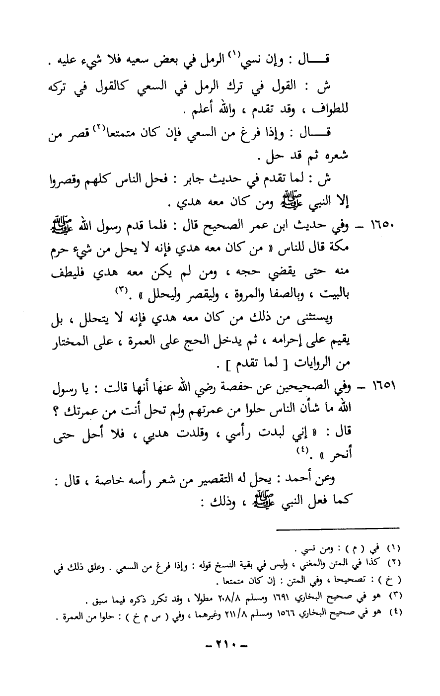 1650 - وفي حديث ابن عمر الصحيح قال: فلما قدم رسول الله - صَلَّى اللَّهُ عَلَيْهِ وَسَلَّمَ - مكة قال للناس «من كان معه هدي فإنه لا يحل من شيء حرم منه حتى يقضي حجه، ومن لم يكن معه هدي فليطف بالبيت، وبالصفا والمروة، وليقصر وليحلل» » .