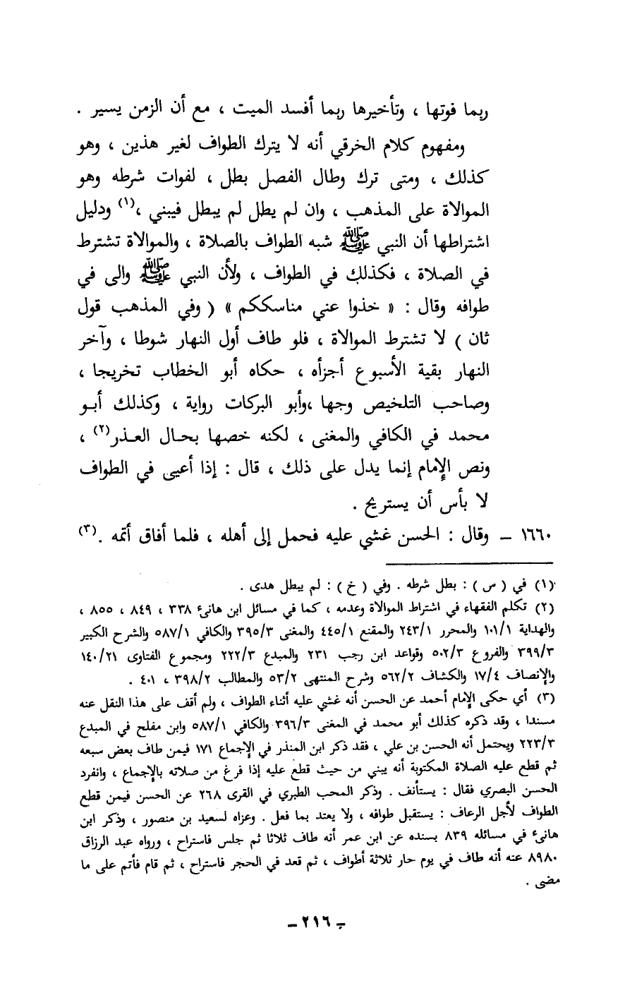 ربما فوتها، وتأخيرها ربما أفسد الميت، مع أن الزمن يسير. ومفهوم كلام الخرقي أنه لا يترك الطواف لغير هذين، وهو كذلك، ومتى ترك وطال الفصل بطل، لفوات شرطه وهو الموالاة على المذهب، وإن لم يطل لم يبطل فيبني، ودليل اشتراطها أن النبي - صَلَّى اللَّهُ عَلَيْهِ وَسَلَّمَ - شبه الطواف بالصلاة، والموالاة تشترط في الصلاة، فكذلك في الطواف، ولأن النبي - صَلَّى اللَّهُ عَلَيْهِ وَسَلَّمَ - والى في طوافه وقال: «خذوا عني مناسككم» (وفي المذهب قول ثان) لا تشترط الموالاة، فلو طاف أول النهار شوطا، وآخر النهار بقية الأسبوع أجزأه، حكاه أبو الخطاب تخريجا، وصاحب التلخيص وجها، وأبو البركات رواية، وكذلك أبو محمد في الكافي والمغنى، لكنه خصها بحال العذر، ونص الإمام إنما يدل على ذلك، قال: إذا أعيى في الطواف لا بأس أن يستريح.