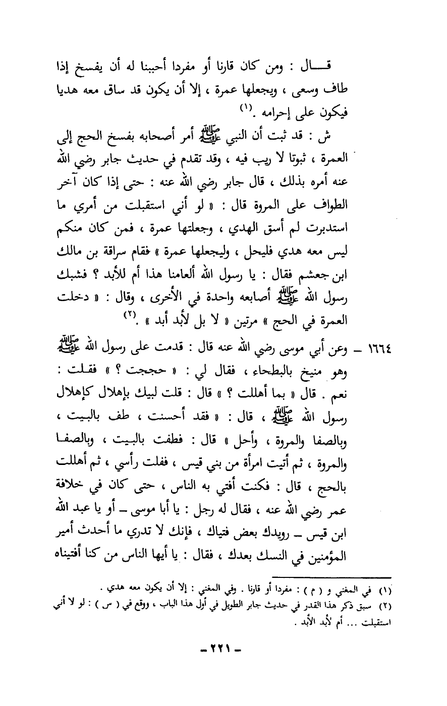 1664 - وعن «أبي موسى - رَضِيَ اللَّهُ عَنْهُ - قال: قدمت على رسول الله - صَلَّى اللَّهُ عَلَيْهِ وَسَلَّمَ - وهو منيخ بالبطحاء، فقال لي: «حججت؟» فقلت: نعم. قال «بما أهللت؟» قال: قلت لبيك بإهلال كإهلال رسول الله - صَلَّى اللَّهُ عَلَيْهِ وَسَلَّمَ -، قال: «فقد أحسنت، طف بالبيت، وبالصفا والمروة، وأحل» قال: فطفت بالبيت، وبالصفا والمروة، ثم أتيت امرأة من بني قيس، ففلت رأسي، ثم أهللت بالحج، قال: فكنت أفتي به الناس، حتى كان في خلافة عمر - رَضِيَ اللَّهُ عَنْهُ -، فقال له رجل: يا أبا موسى - أو يا عبد الله بن قيس - رويدك بعض فتياك، فإنك لا تدري ما أحدث أمير المؤمنين في النسك بعدك، فقال: يا أيها الناس من كنا أفتيناه