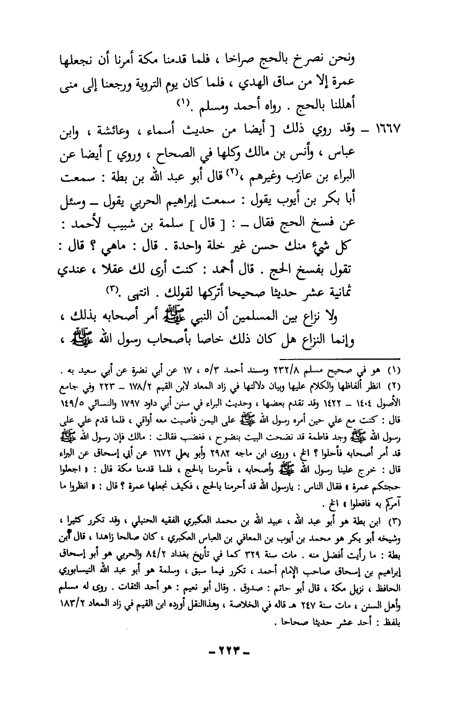 1667 - وقد روي ذلك [أيضا من حديث أسماء، وعائشة، وابن عباس، وأنس بن مالك وكلها في الصحاح، وروي] أيضا عن البراء بن عازب وغيرهم، قال أبو عبد الله بن بطة: سمعت أبا بكر بن أيوب يقول: سمعت إبراهيم الحربي يقول - وسئل عن فسخ الحج فقال -: [قال] سلمة بن شبيب لأحمد: كل شيء منك حسن غير خلة واحدة، قال: ما هي؟ قال: تقول بفسخ الحج، قال أحمد: كنت أرى لك عقلا، عندي ثمانية عشر حديثا صحيحا أتركها لقولك. انتهى.