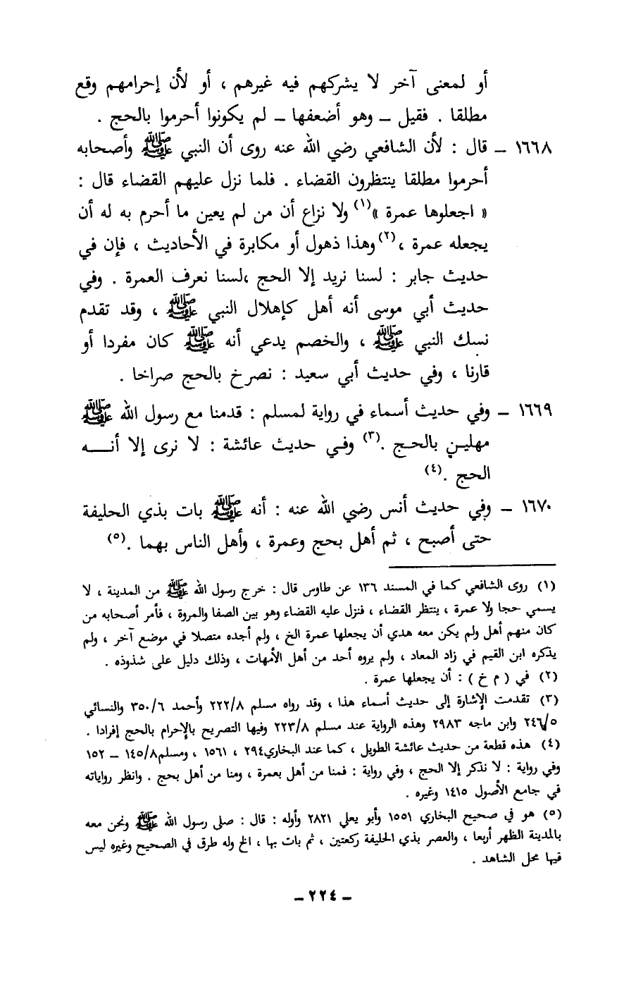 1668 - قال: لأن الشافعي - رَضِيَ اللَّهُ عَنْهُ - روى أن النبي - صَلَّى اللَّهُ عَلَيْهِ وَسَلَّمَ - وأصحابه أحرموا مطلقا ينتظرون القضاء. فلما نزل عليهم القضاء قال: «اجعلوها عمرة» ولا نزاع أن من لم يعين ما أحرم به له أن يجعله عمرة، وهذا ذهول أو مكابرة في الأحاديث، فإن في حديث جابر: لسنا نريد إلا الحج، لسنا نعرف العمرة. وفي حديث أبي موسى أنه أهل كإهلال النبي - صَلَّى اللَّهُ عَلَيْهِ وَسَلَّمَ -، وقد تقدم نسك النبي - صَلَّى اللَّهُ عَلَيْهِ وَسَلَّمَ -، والخصم يدعي أنه - صَلَّى اللَّهُ عَلَيْهِ وَسَلَّمَ - كان مفردا أو قارنا، وفي حديث أبي سعيد: نصرخ بالحج صراخا.