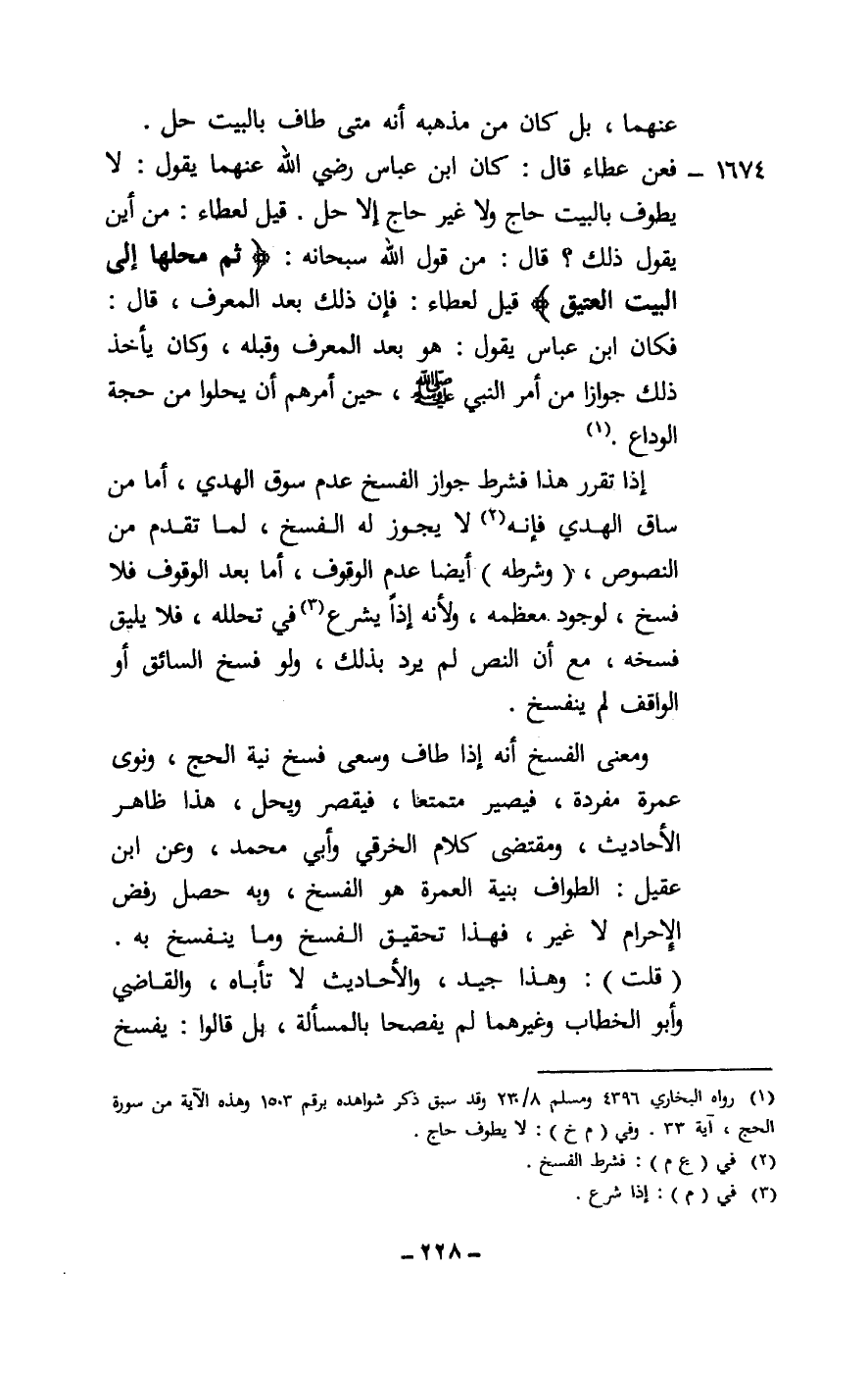 1674 - فعن عطاء قال: كان ابن عباس - رَضِيَ اللَّهُ عَنْهُمَا - يقول: لا يطوف بالبيت حاج ولا غير حاج إلا حل. قيل لعطاء: من أين يقول ذلك؟ قال: من قول الله سبحانه: {ثُمَّ مَحِلُّهَا إِلَى الْبَيْتِ الْعَتِيقِ} [الحج: 33] قيل لعطاء: فإن ذلك بعد المعرف، قال: فكان ابن عباس يقول: هو بعد المعرف وقبله، وكان يأخذ ذلك جوازا من أمر النبي - صَلَّى اللَّهُ عَلَيْهِ وَسَلَّمَ -، حين أمرهم أن يحلوا من حجة الوداع.