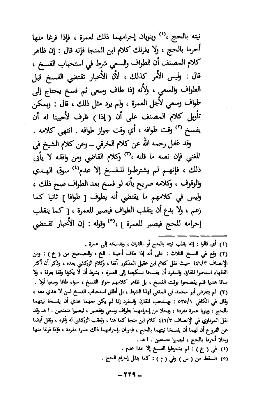 وقد غفل - رَحِمَهُ اللَّهُ - عن كلام الخرقي - وعن كلام الشيخ في المغني فإن نصه ما قلته، وكلام القاضي ومن وافقه لا يأبى ذلك، فإنهم لم يشترطوا للفسخ إلا عدم سوق الهدي والوقوف، وكلامه صريح بأنه لو فسخ بعد الطواف صح ذلك، وليس في كلامهم ما يقتضي أنه يطوف [طوافا] ثانيا كما زعم، ولا بدع أن ينقلب الطواف فيصير للعمرة، [كما ينقلب إحرامه للحج فيصير للعمرة] ، وقوله: إن الأخبار تقتضي