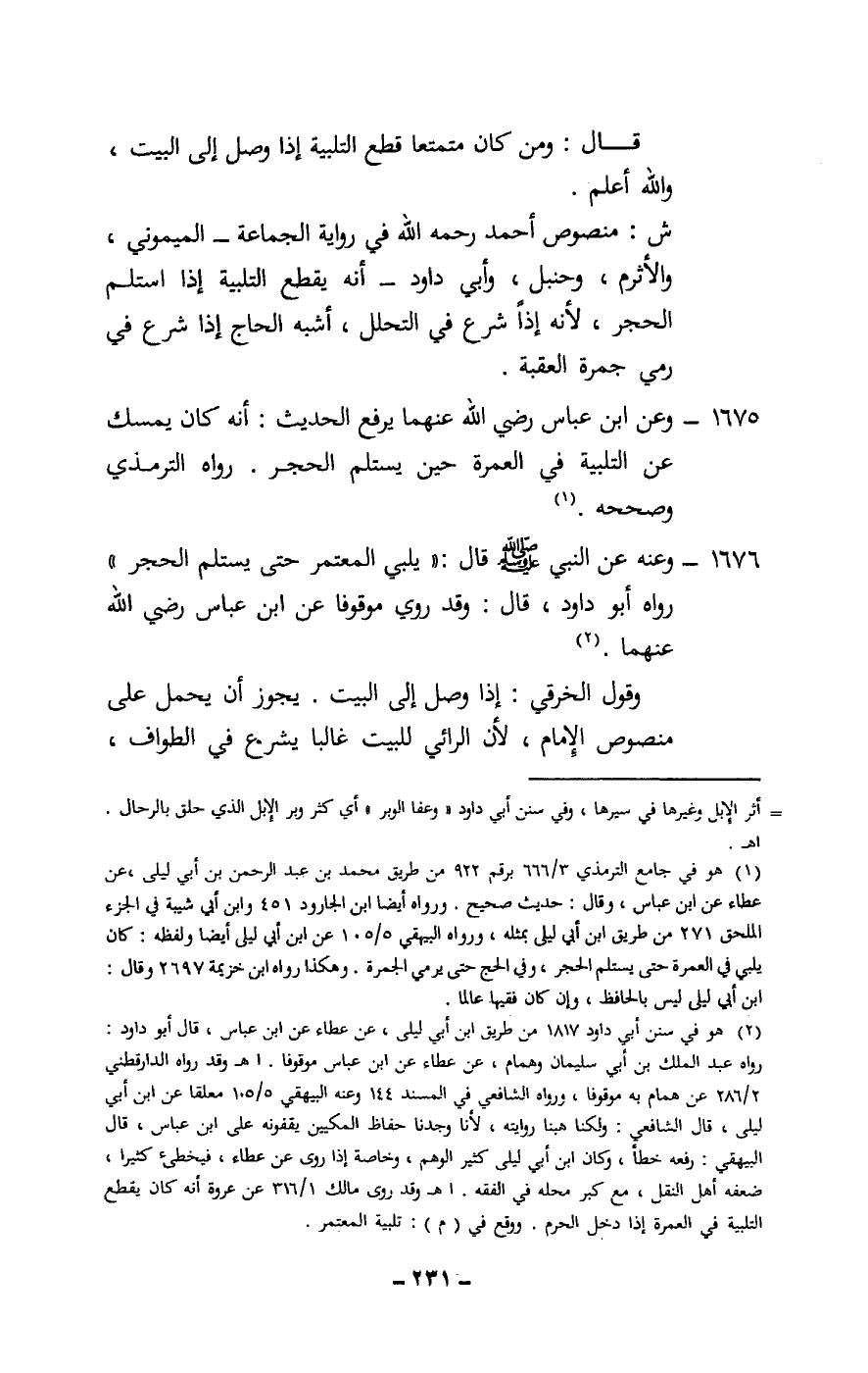 1676 - وعنه عن النبي - صَلَّى اللَّهُ عَلَيْهِ وَسَلَّمَ - قال: «يلبي المعتمر حتى يستلم الحجر» رواه أبو داود، قال: وقد روي موقوفا عن ابن عباس - رَضِيَ اللَّهُ عَنْهُمَا -.