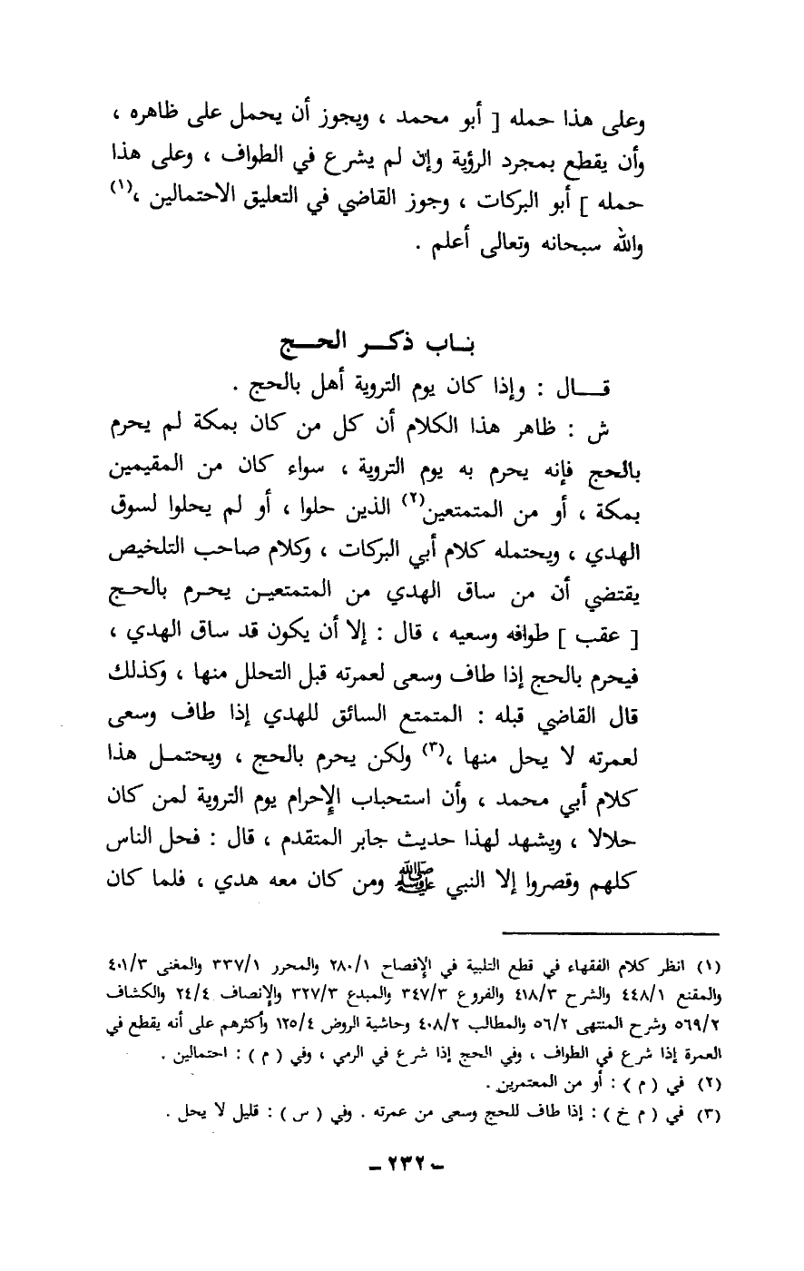 ش: ظاهر هذا الكلام أن كل من كان بمكة لم يحرم بالحج فإنه يحرم به يوم التروية، سواء كان من المقيمين بمكة، أو من المتمتعين الذين حلوا، أو لم يحلوا لسوق الهدي، ويحتمله كلام أبي البركات، وكلام صاحب التلخيص يقتضي أن من ساق الهدي من المتمتعين يحرم بالحج [عقب] طوافه وسعيه، قال: إلا أن يكون قد ساق الهدي، فيحرم بالحج إذا طاف وسعى لعمرته قبل التحلل منها، وكذلك قال القاضي قبله: المتمتع السائق للهدي إذا طاف وسعى لعمرته لا يحل منها، ولكن يحرم بالحج، ويحتمل هذا كلام أبي محمد، وأن استحباب الإحرام يوم التروية لمن كان حلالا، ويشهد لهذا حديث جابر المتقدم، قال: «فحل الناس كلهم وقصروا إلا النبي - صَلَّى اللَّهُ عَلَيْهِ وَسَلَّمَ - ومن كان معه هدي، فلما كان