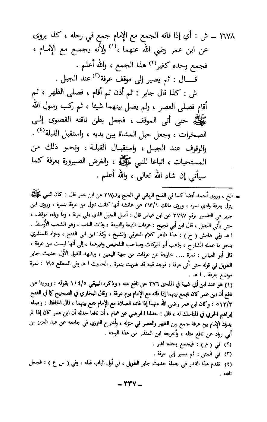 ش: كذا قال جابر: «ثم أذن ثم أقام، فصلى الظهر، ثم أقام فصلى العصر، ولم يصل بينهما شيئا، ثم ركب رسول الله - صَلَّى اللَّهُ عَلَيْهِ وَسَلَّمَ - حتى أتى الموقف، فجعل بطن ناقته القصوى إلى الصخرات، وجعل حبل المشاة بين يديه، واستقبل القبلة» . والوقوف عند الجبل، واستقبال القبلة، ونحو ذلك من المستحبات، اتباعا للنبي – - صَلَّى اللَّهُ عَلَيْهِ وَسَلَّمَ - كما سيأتي إن شاء الله تعالى، والله أعلم.