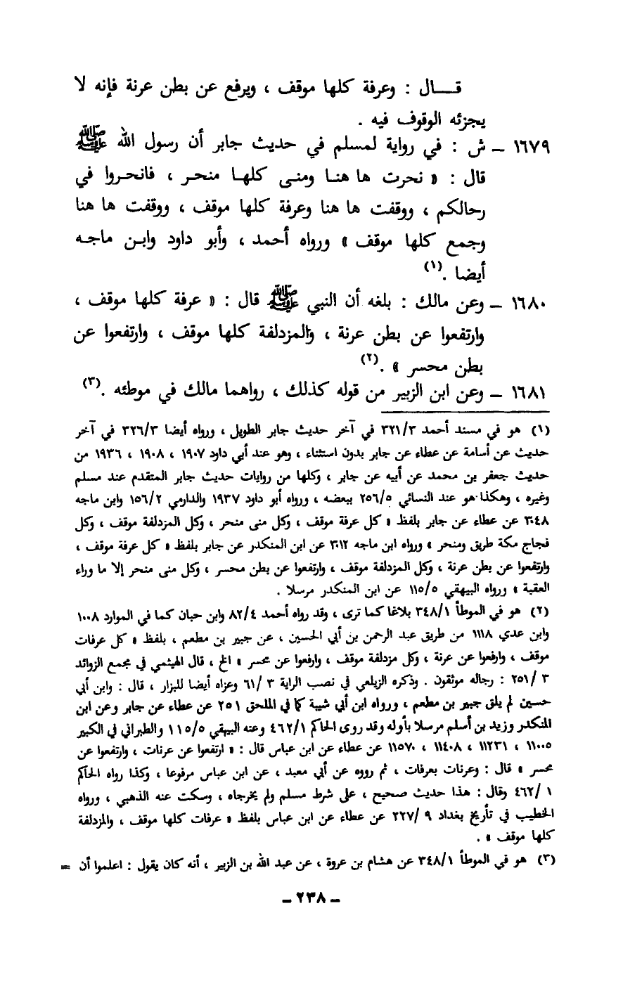 1680 - وعن مالك: بلغه أن النبي - صَلَّى اللَّهُ عَلَيْهِ وَسَلَّمَ - قال: «عرفة كلها موقف، وارتفعوا عن بطن عرنة، والمزدلفة كلها موقف، وارتفعوا عن بطن محسر» .