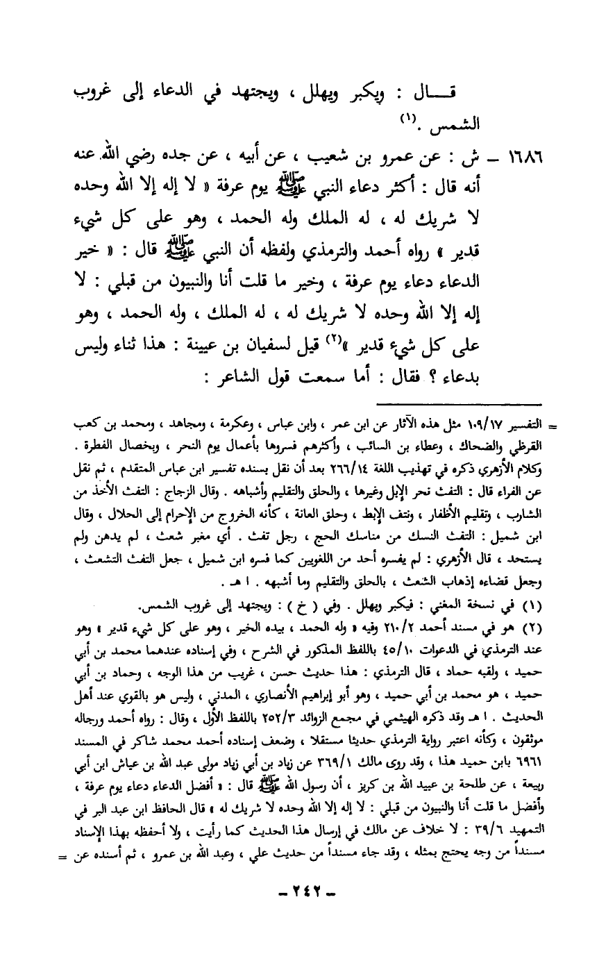 1686 - ش: عن عمرو بن شعيب، عن أبيه، عن جده - رَضِيَ اللَّهُ عَنْهُ - أنه قال: «أكثر دعاء النبي - صَلَّى اللَّهُ عَلَيْهِ وَسَلَّمَ - يوم عرفة «لا إله إلا الله وحده لا شريك له، له الملك وله الحمد، وهو على كل شيء قدير» رواه أحمد والترمذي ولفظه أن النبي - صَلَّى اللَّهُ عَلَيْهِ وَسَلَّمَ - قال: «خير الدعاء دعاء يوم عرفة، وخير ما قلت أنا والنبيون من قبلي: لا إله إلا الله وحده لا شريك له، له الملك، وله الحمد، وهو على كل شيء قدير» » قيل لسفيان بن عيينة: هذا ثناء وليس بدعاء؟ فقال: أما سمعت قول الشاعر: