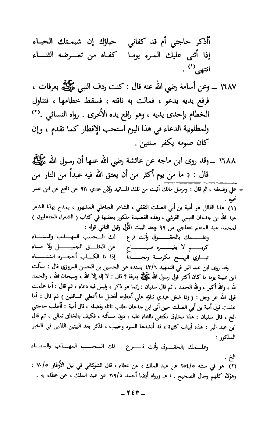 1687 - «وعن أسامة - رَضِيَ اللَّهُ عَنْهُ - قال: كنت ردف النبي - صَلَّى اللَّهُ عَلَيْهِ وَسَلَّمَ - بعرفات، فرفع يديه يدعو، فمالت به ناقته، فسقط خطامها، فتناول الخطام بإحدى يديه، وهو رافع يده الأخرى» . رواه النسائي. ولمطلوبية الدعاء في هذا اليوم استحب الإفطار كما تقدم، وإن كان صومه يكفر سنتين.