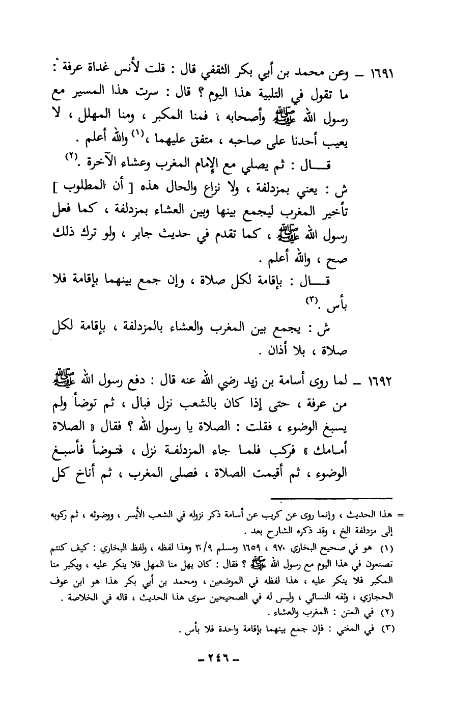 1691 - وعن «محمد بن أبي بكر الثقفي قال: قلت لأنس غداة غرفة: ما تقول في التلبية هذا اليوم؟ قال: سرت هذا المسير مع رسول الله - صَلَّى اللَّهُ عَلَيْهِ وَسَلَّمَ - وأصحابه، فمنا المكبر، ومنا المهلل، لا يعيب أحدنا على صاحبه» ، متفق عليهما، والله أعلم.