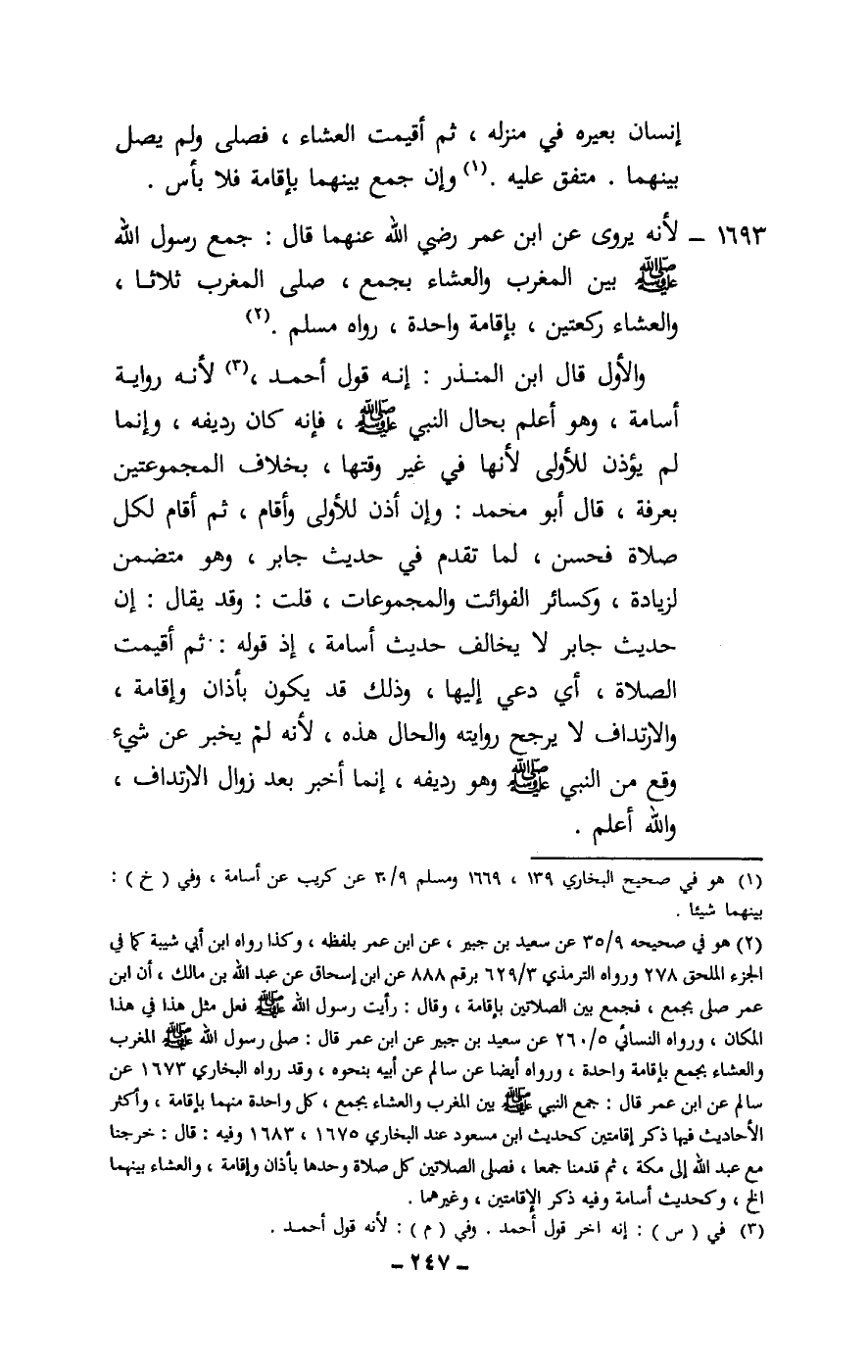 1693 - لأنه يروى عن ابن عمر - رَضِيَ اللَّهُ عَنْهُمَا - قال: «جمع رسول الله - صَلَّى اللَّهُ عَلَيْهِ وَسَلَّمَ - بين المغرب والعشاء بجمع، صلى المغرب ثلاثا، والعشاء ركعتين، بإقامة واحدة» ، رواه مسلم.