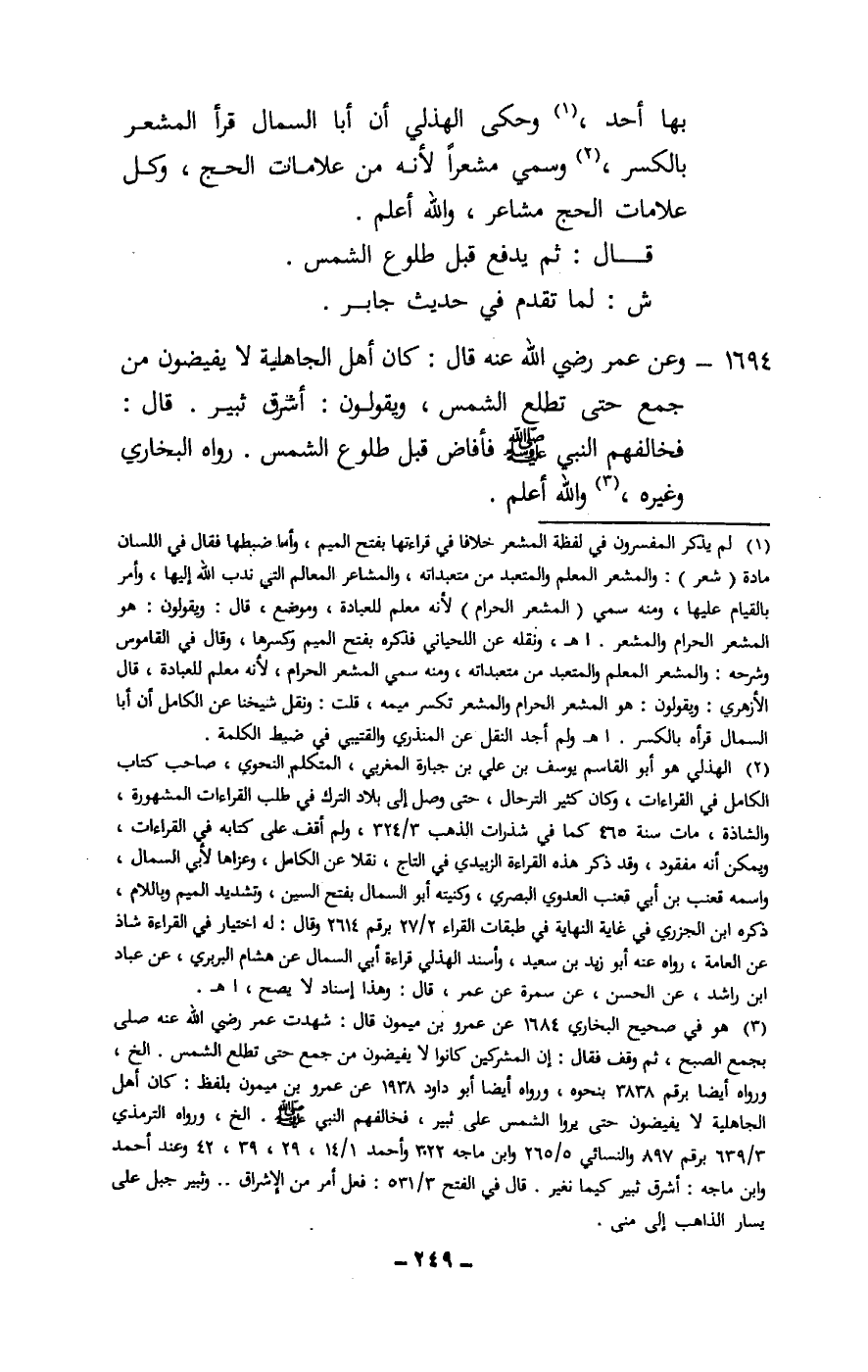 1694 - وعن عمر - رَضِيَ اللَّهُ عَنْهُ - قال: «كان أهل الجاهلية لا يفيضون من جمع حتى تطلع الشمس، ويقولون: أشرق ثبير. قال: فخالفهم النبي - صَلَّى اللَّهُ عَلَيْهِ وَسَلَّمَ - فأفاض قبل طلوع الشمس» . رواه البخاري وغيره، والله أعلم.
