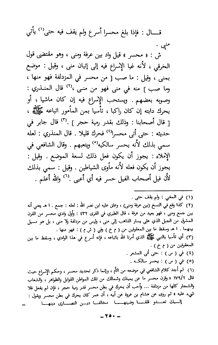 ش: «محسر» قيل: واد بين عرفة ومنى، وهو مقتضى قول الخرقي، لأنه غيا الإسراع فيه إلى إتيان منى، وقيل: موضع بمنى، وقيل: ما صب [من محسر في المزدلفة فهو منها، وما صب] منه في منى فهو من منى، قال المنذري: وصوبه بعضهم، ويستحب الإسراع فيه إن كان ماشيا، أو يحرك دابته إن كان راكبا، تأسيا بمن المأمور اتباعه - صَلَّى اللَّهُ عَلَيْهِ وَسَلَّمَ -، [قال أصحابنا: وذلك بقدر رمية حجر] . قال جابر في حديثه: حتى أتى محسرا فحرك قليلا. قال المنذري: لعله سمي بذلك لأنه يحسر سالكيه ويتبعهم. وقال الشافعي في الإملاء: يجوز أن يكون فعل ذلك لسعة الموضع. وقيل: يجوز أن يكون فعله لأنه مأوى الشياطين. وقيل: سمي بذلك لأن فيل أصحاب الفيل حسر فيه أي أعيى. والله أعلم.