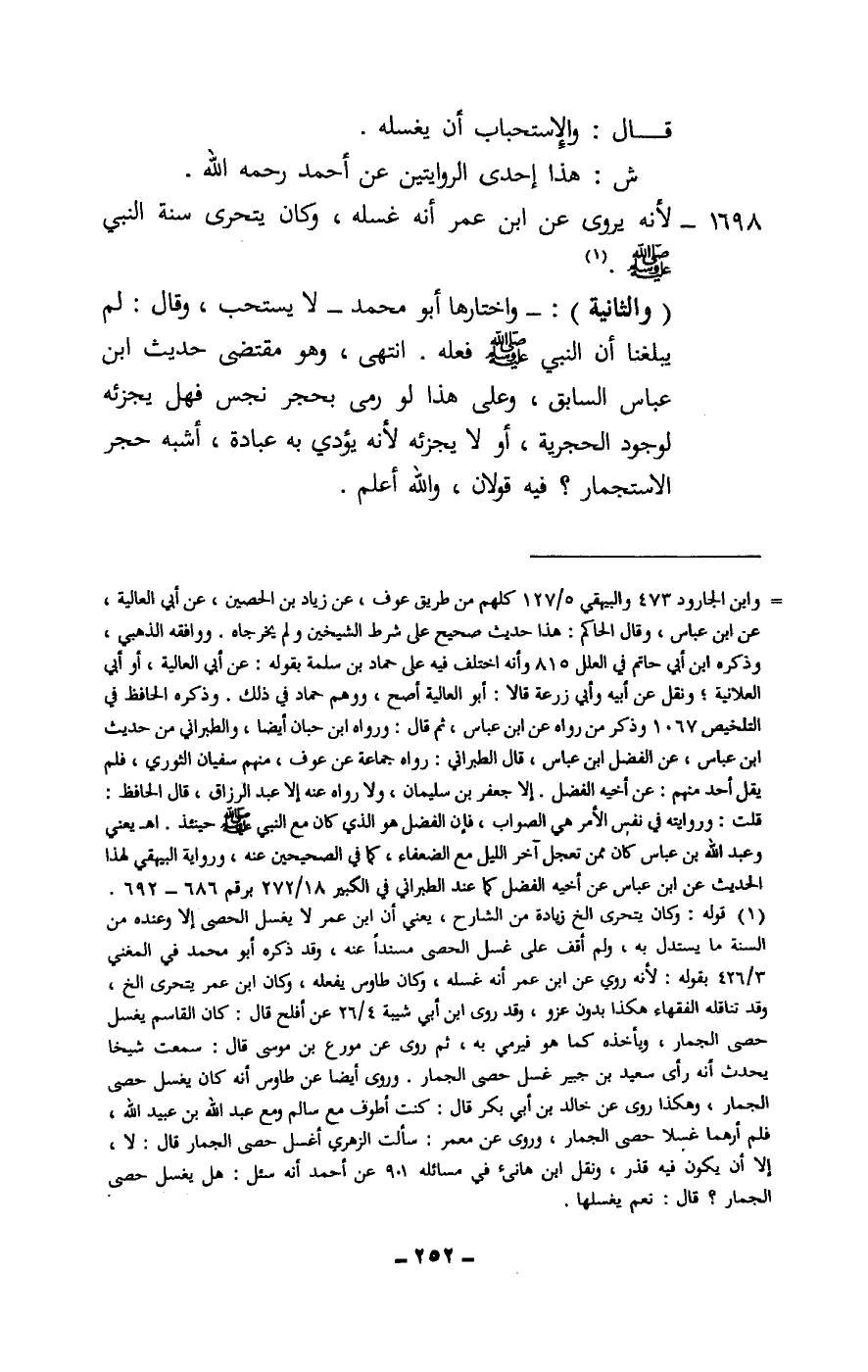 1698 - لأنه يروى عن ابن عمر أنه غسله، وكان يتحرى سنة النبي - صَلَّى اللَّهُ عَلَيْهِ وَسَلَّمَ -.