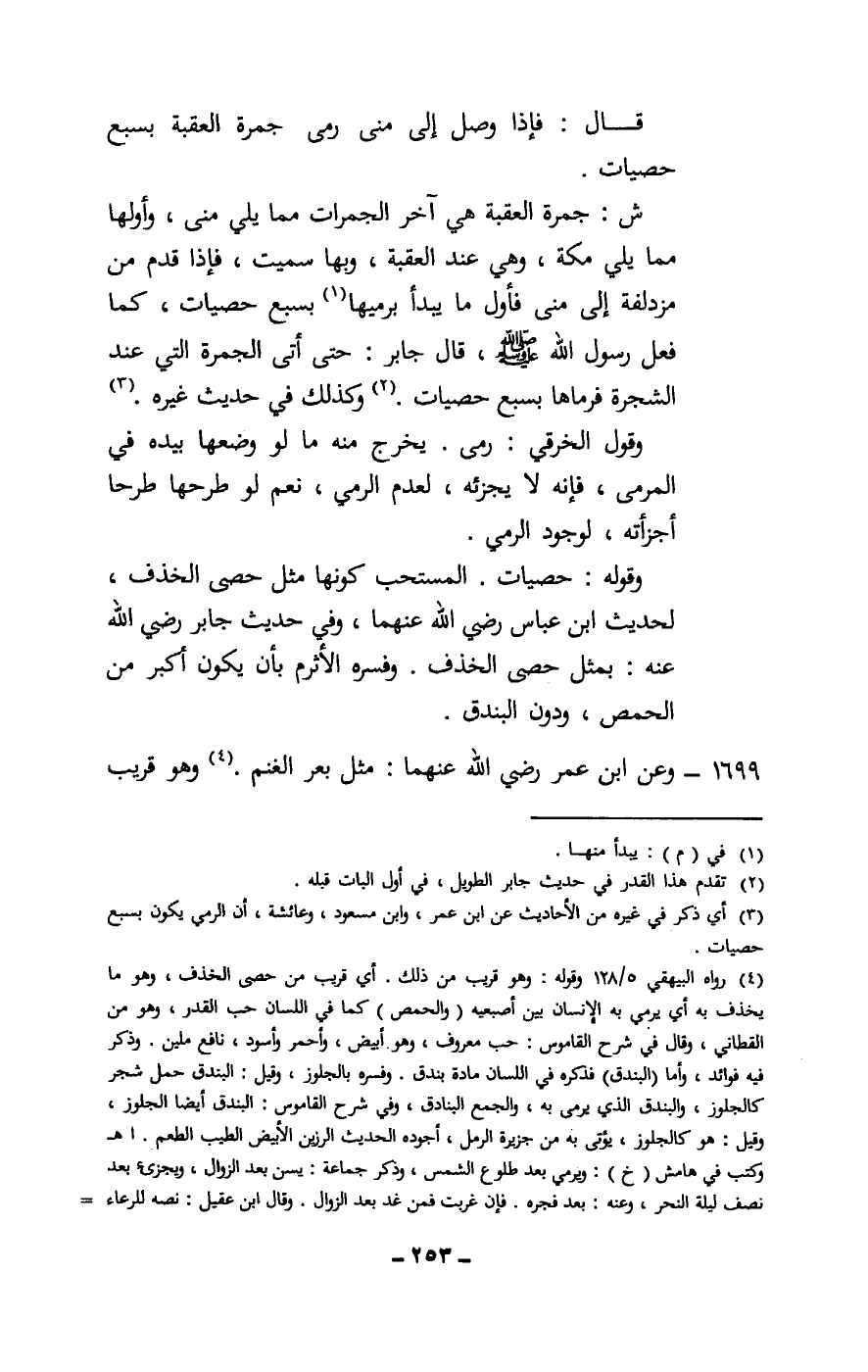 ش: جمرة العقبة هي آخر الجمرات مما يلي منى، وأولها مما يلي مكة، وهي عند العقبة، وبها سميت، فإذا قدم من مزدلفة إلى منى فأول ما يبدأ برميها بسبع حصيات، كما فعل رسول الله - صَلَّى اللَّهُ عَلَيْهِ وَسَلَّمَ -، قال جابر: حتى أتى الجمرة التي عند الشجرة فرماها بسبع حصيات. وكذلك في حديث غيره.