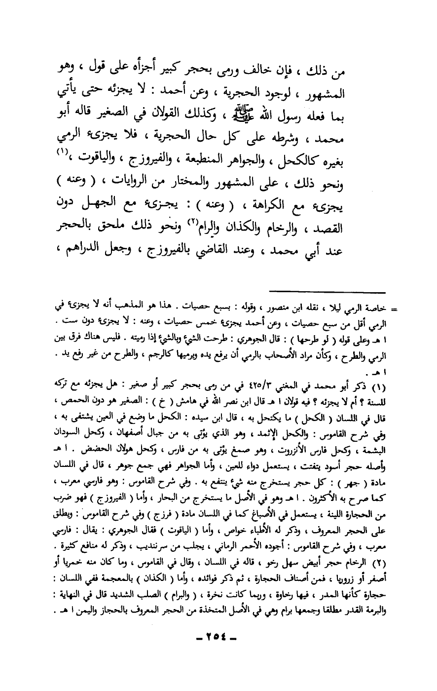 من ذلك، فإن خالف ورمى بحجر كبير أجزأه على قول، وهو المشهور، لوجود الحجرية، وعن أحمد: لا يجزئه حتى يأتي بما فعله رسول الله - صَلَّى اللَّهُ عَلَيْهِ وَسَلَّمَ -، وكذلك القولان في الصغير قاله أبو محمد، وشرطه على كل حال الحجرية، فلا يجزئ الرمي بغيره كالكحل، والجواهر المنطبعة، والفيروزج، والياقوت، ونحو ذلك، على المشهور والمختار من الروايات، (وعنه) : يجزئ مع الجهل دون القصد، والرخام والكذان والرام ونحو ذلك ملحق بالحجر عند أبي محمد، وعند القاضي بالفيروزج، وجعل الدراهم،
