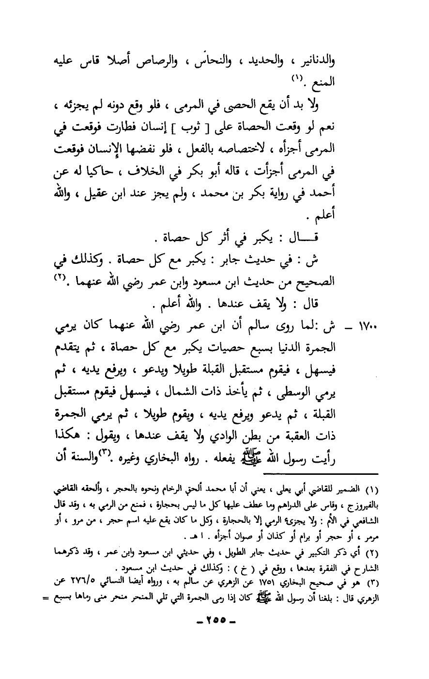 1700 - ش: لما روى سالم «أن ابن عمر - رَضِيَ اللَّهُ عَنْهُمَا - كان يرمي الجمرة الدنيا بسبع حصيات يكبر مع كل حصاة، ثم يتقدم فيسهل، فيقوم مستقبل القبلة طويلا ويدعو، ويرفع يديه، ثم يرمي الوسطى، ثم يأخذ ذات الشمال، فيسهل فيقوم مستقبل القبلة، ثم يدعو ويرفع يديه، ويقوم طويلا، ثم يرمي الجمرة ذات العقبة من بطن الوادي ولا يقف عندها، ويقول: هكذا رأيت رسول الله - صَلَّى اللَّهُ عَلَيْهِ وَسَلَّمَ - يفعله» . رواه البخاري وغيره. والسنة أن
