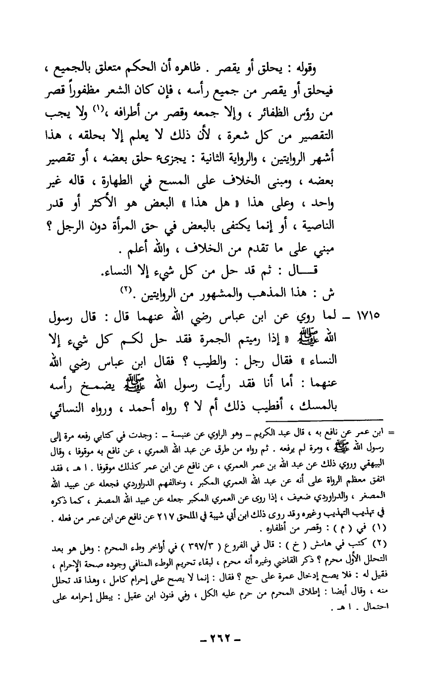 1715 - لما روي عن ابن عباس - رَضِيَ اللَّهُ عَنْهُمَا - قال: قال رسول الله - صَلَّى اللَّهُ عَلَيْهِ وَسَلَّمَ - «إذا رميتم الجمرة فقد حل لكم كل شيء إلا النساء» . فقال رجل: والطيب؟ فقال ابن عباس - رَضِيَ اللَّهُ عَنْهُمَا -: أما أنا فقد رأيت رسول الله - صَلَّى اللَّهُ عَلَيْهِ وَسَلَّمَ - يضمخ رأسه بالمسك، أفطيب ذلك أم لا؟» رواه أحمد، ورواه النسائي