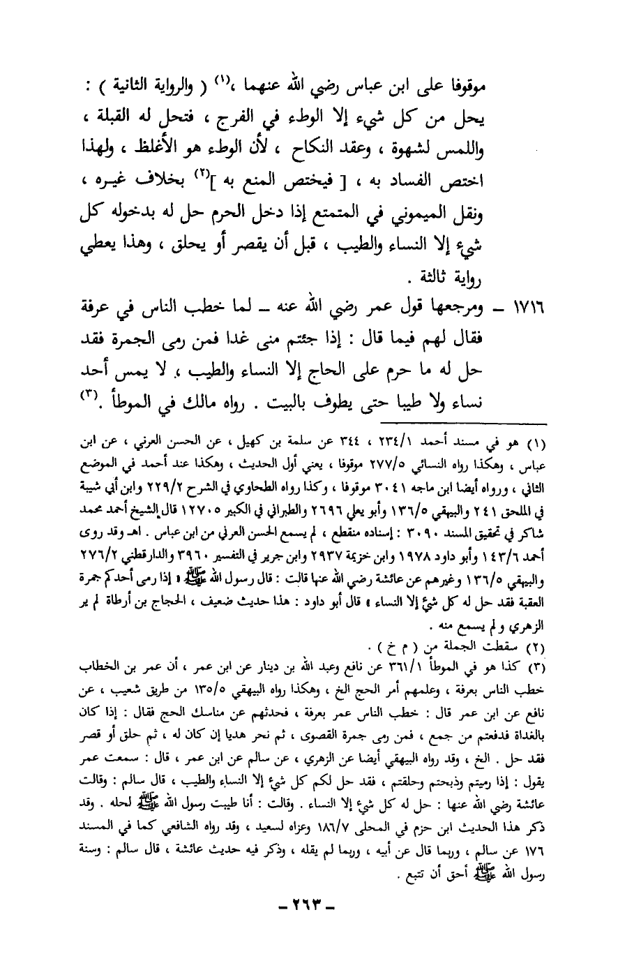 1716 - ومرجعها قول عمر - رَضِيَ اللَّهُ عَنْهُ - لما خطب الناس في عرفة فقال لهم فيما قال: إذا جئتم منى غدا فمن رمى الجمرة فقد حل له ما حرم على الحاج إلا النساء والطيب، لا يمس أحد نساء ولا طيبا حتى يطوف بالبيت، رواه مالك في الموطأ.