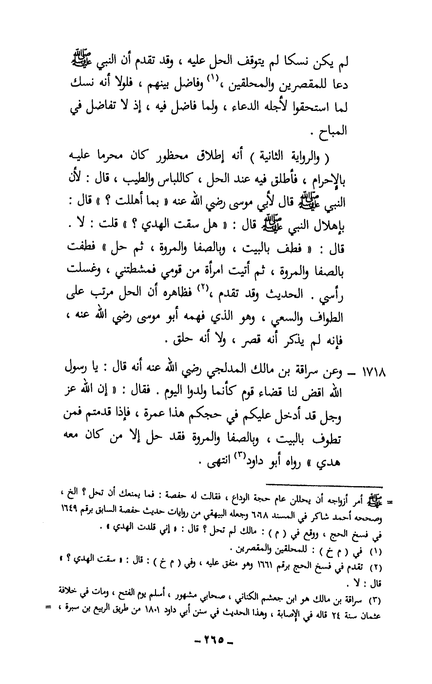 1718 - «وعن سراقة بن مالك المدلجي - رَضِيَ اللَّهُ عَنْهُ - أنه قال: يا رسول الله اقض لنا قضاء قوم كأنما ولدوا اليوم. فقال: «إن الله عز وجل قد أدخل عليكم في حجكم هذا عمرة، فإذا قدمتم فمن تطوف بالبيت وبالصفا والمروة، فقد حل، إلا من كان معه هدي» . رواه أبو داود، انتهى.