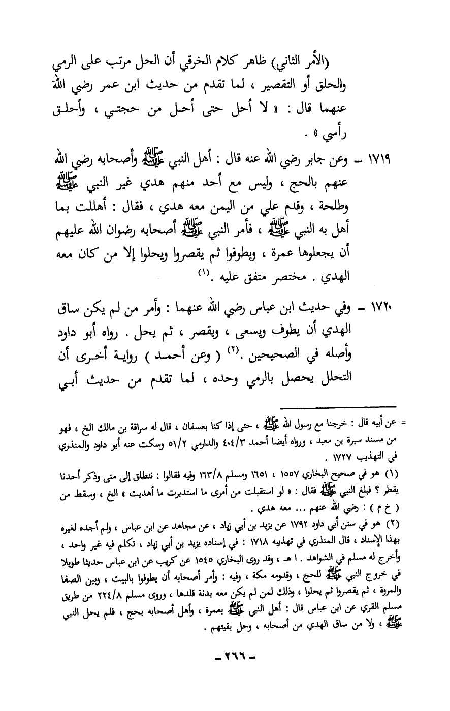 1720 - وفي حديث ابن عباس - رَضِيَ اللَّهُ عَنْهُمَا -: «وأمر من لم يكن ساق الهدي أن يطوف ويسعى، ويقصر، ثم يحل» . رواه أبو داود، وأصله في الصحيحين. (وعن أحمد) ، رواية أخرى، أن التحلل يحصل بالرمي وحده، لما تقدم من حديث أبي