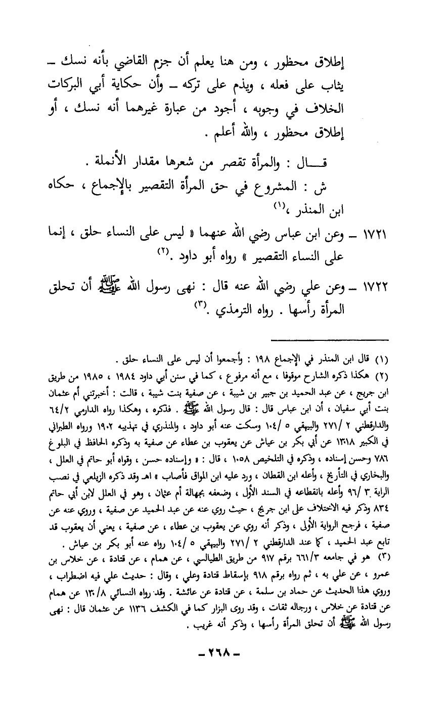 1721 - وعن ابن عباس - رَضِيَ اللَّهُ عَنْهُمَا -: «ليس على النساء حلق، إنما على النساء التقصير» . رواه أبو داود.