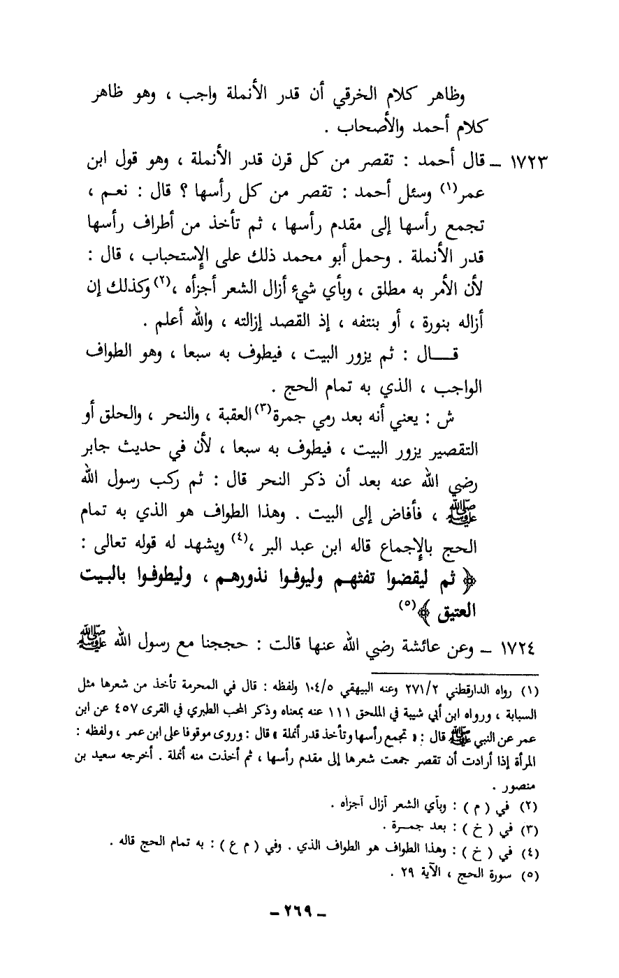 1723 - قال أحمد: تقصر من كل قرن قدر الأنملة، وهو قول ابن عمر، وسئل أحمد: تقصر من كل رأسها؟ قال: نعم، تجمع رأسها إلى مقدم رأسها، ثم تأخذ من أطراف رأسها قدر الأنملة. وحمل أبو محمد ذلك على الاستحباب، قال: لأن الأمر به مطلق، وبأي شيء أزال الشعر أجزأه، وكذلك إن أزاله بنورة، أو بنتفه، إذ القصد إزالته، والله أعلم.