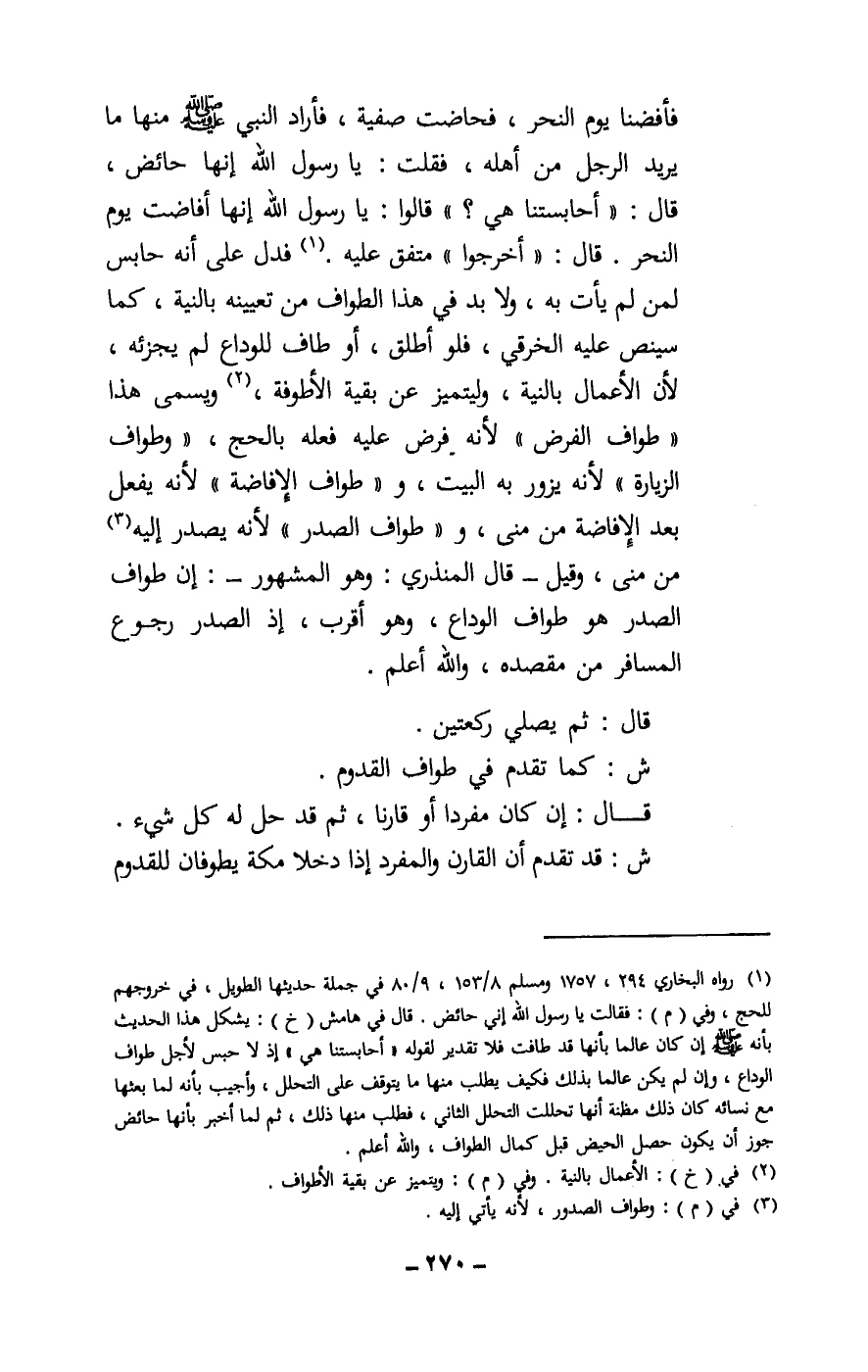 فأفضنا يوم النحر، فحاضت صفية، فأراد النبي - صَلَّى اللَّهُ عَلَيْهِ وَسَلَّمَ - منها ما يريد الرجل من أهله، فقلت: يا رسول الله إنها حائض، قال: «أحابستنا هي؟» . قالوا: يا رسول الله إنها أفاضت يوم النحر. قال: «اخرجوا» . متفق عليه. فدل على أنه حابس لمن لم يأت به، ولا بد في هذا الطواف من تعيينه بالنية، كما سينص عليه الخرقي، فلو أطلق، أو طاف للوداع لم يجزئه، لأن الأعمال بالنية، وليتميز عن بقية الأطوفة، ويسمى هذا: «طواف الفرض» . لأنه فرض عليه فعله بالحج، «وطواف الزيارة» . لأنه يزور به البيت، و «طواف الإفاضة» . لأنه يفعل بعد الإفاضة من منى، و «طواف الصدر» . لأنه يصدر إليه من منى، وقيل - قال المنذري: وهو المشهور -: إن طواف الصدر هو طواف الوداع، وهو أقرب، إذ الصدر رجوع المسافر من مقصده، والله أعلم.