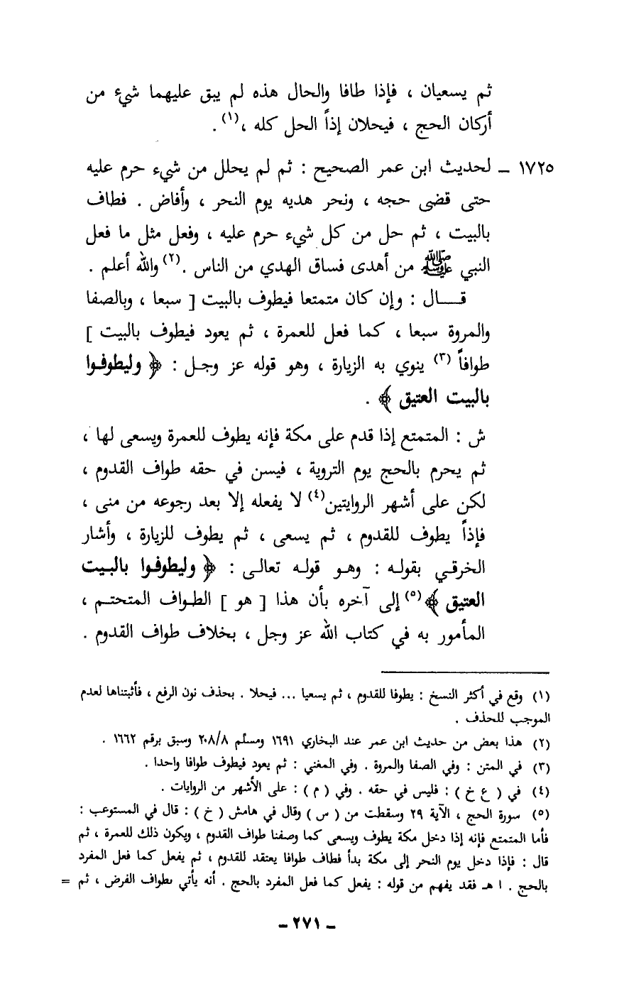 1725 - لحديث ابن عمر الصحيح: «ثم لم يحلل من شيء حرم عليه حتى قضى حجه، ونحر هديه يوم النحر، وأفاض. فطاف بالبيت، ثم حل من كل شيء حرم عليه» ، وفعل مثل ما فعل النبي - صَلَّى اللَّهُ عَلَيْهِ وَسَلَّمَ - من أهدى فساق الهدي من الناس. والله أعلم.