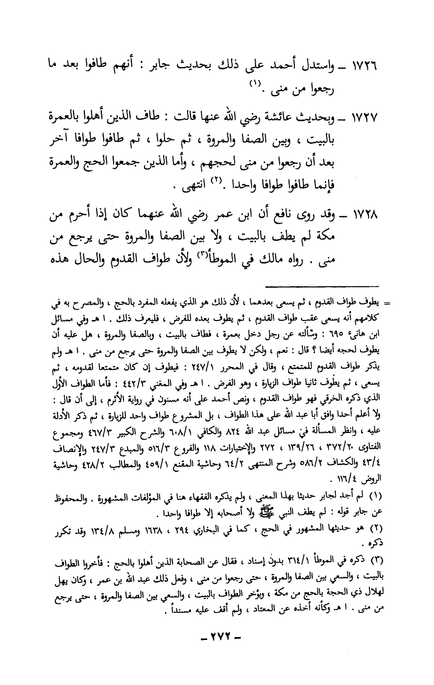 1726 - واستدل أحمد على ذلك بحديث جابر: أنهم طافوا بعدما رجعوا من منى.