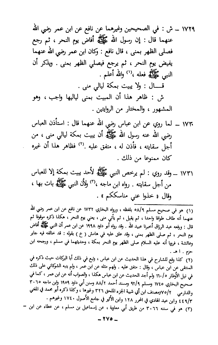 1729 - ش: في الصحيحين وغيرهما عن نافع، عن ابن عمر، - رَضِيَ اللَّهُ عَنْهُمَا -، قال: «إن رسول الله - صَلَّى اللَّهُ عَلَيْهِ وَسَلَّمَ - أفاض يوم النحر، ثم رجع فصلى الظهر بمنى، قال نافع: وكان ابن عمر، - رَضِيَ اللَّهُ عَنْهُمَا -، يفيض يوم النحر، ثم يرجع فيصلي الظهر بمنى، ويذكر أن النبي - صَلَّى اللَّهُ عَلَيْهِ وَسَلَّمَ - فعله» ، والله أعلم.