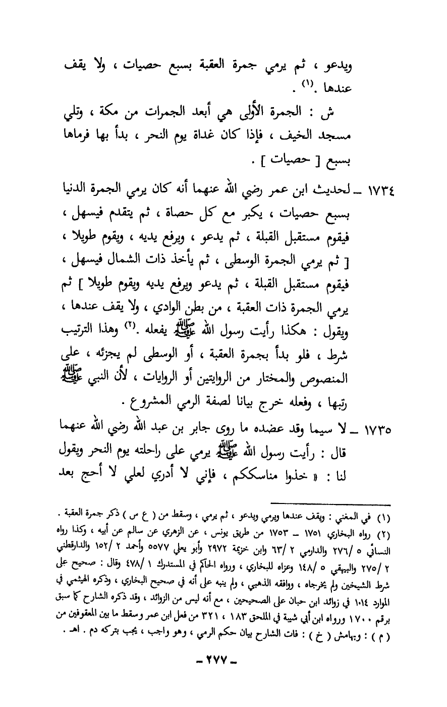 1734 - «لحديث ابن عمر - رَضِيَ اللَّهُ عَنْهُمَا - أنه كان يرمي الجمرة الدنيا بسبع حصيات، يكبر مع كل حصاة، ثم يتقدم فيسهل، فيقوم مستقبل القبلة، ثم يدعو، ويرفع يديه، ويقوم طويلا، [ثم يرمي الجمرة الوسطى، ثم يأخذ ذات الشمال فيسهل، فيقوم مستقبل القبلة، ثم يدعو ويرفع يديه ويقوم طويلا] ، ثم يرمي الجمرة ذات العقبة، من بطن الوادي، ولا يقف عندها، ويقول: هكذا رأيت رسول الله - صَلَّى اللَّهُ عَلَيْهِ وَسَلَّمَ - يفعله» .