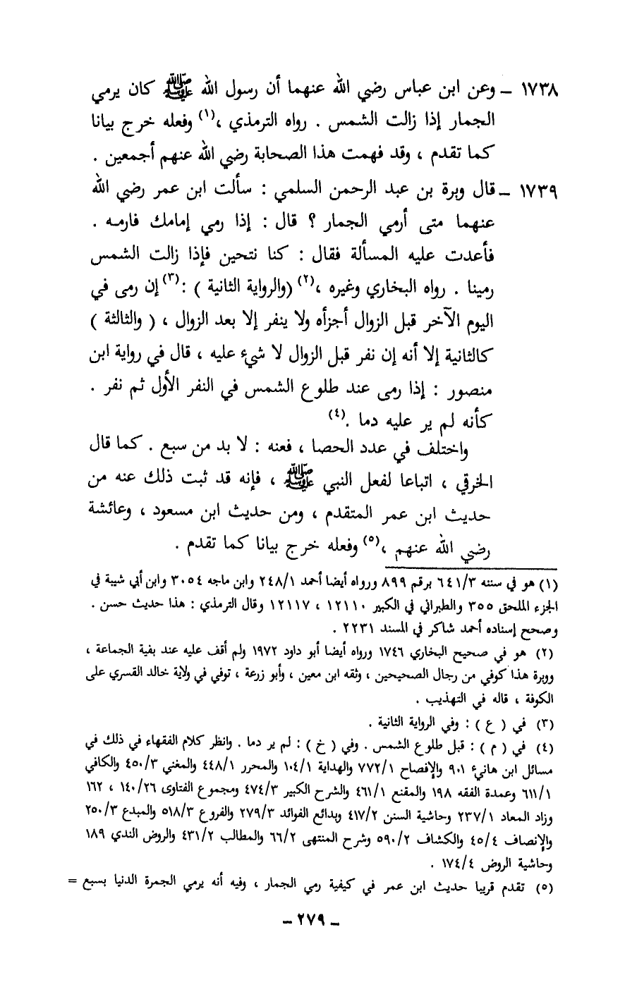 1738 - وعن ابن عباس - رَضِيَ اللَّهُ عَنْهُمَا - «أن رسول الله - صَلَّى اللَّهُ عَلَيْهِ وَسَلَّمَ - كان يرمي الجمار إذا زالت الشمس» . رواه الترمذي، وفعله خرج بيانا كما تقدم، وقد فهمت هذا الصحابة - رَضِيَ اللَّهُ عَنْهُمْ أَجْمَعِينَ -.