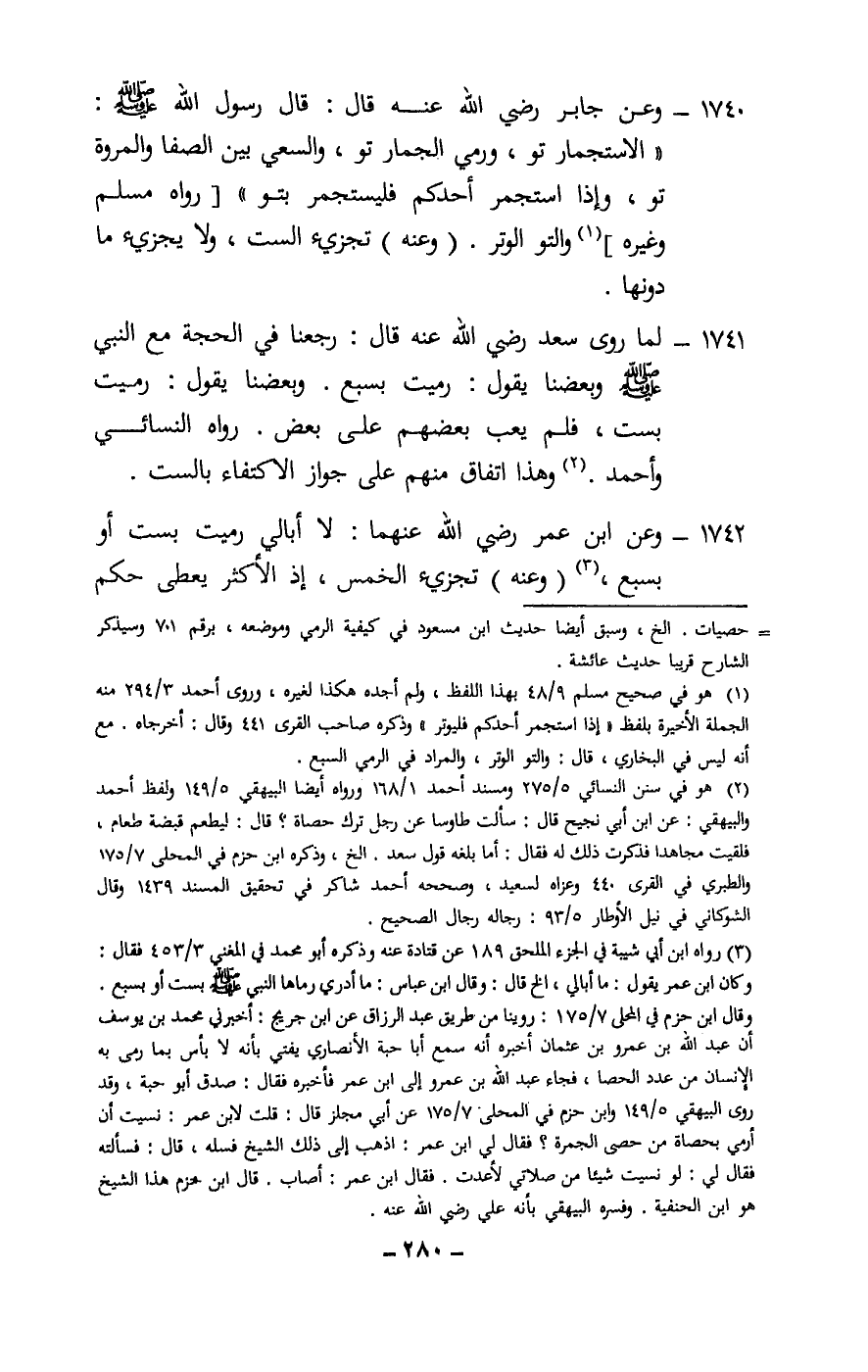 1741 - لما «روى سعد - رَضِيَ اللَّهُ عَنْهُ - قال: رجعنا في الحجة مع النبي - صَلَّى اللَّهُ عَلَيْهِ وَسَلَّمَ - وبعضنا يقول: رميت بسبع. وبعضنا يقول: رميت بست، فلم يعب بعضهم على بعض» . رواه النسائي وأحمد. وهذا اتفاق منهم على جواز الاكتفاء بالست.