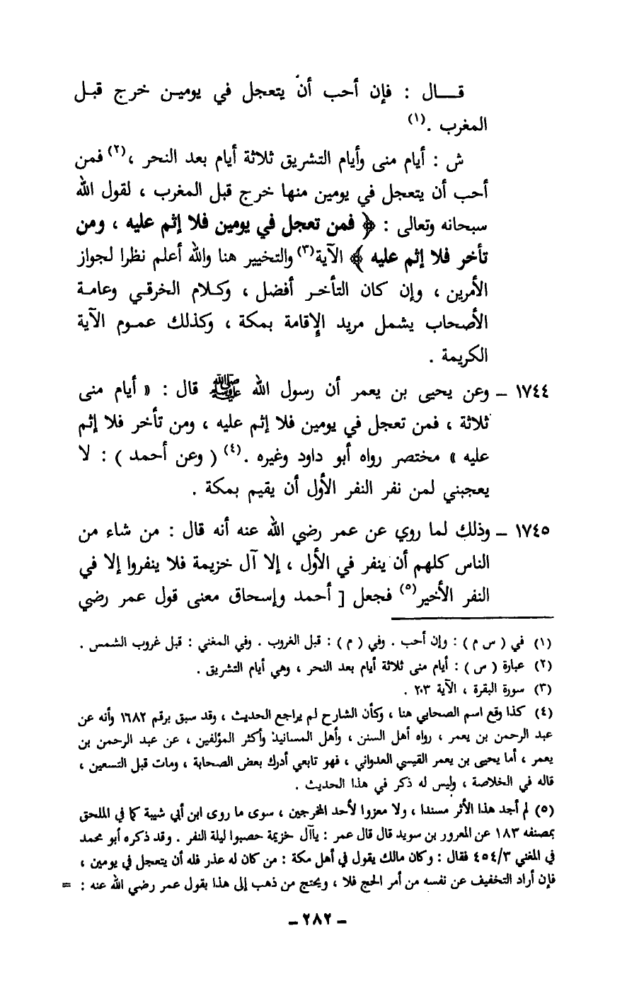 1744 - وعن يحيى بن يعمر أن رسول الله - صَلَّى اللَّهُ عَلَيْهِ وَسَلَّمَ - قال: «أيام منى ثلاثة، فمن تعجل في يومين فلا إثم عليه، ومن تأخر فلا إثم عليه» . مختصر، رواه أبو داود وغيره. (وعن أحمد) : لا يعجبني لمن نفر النفر الأول أن يقيم بمكة.